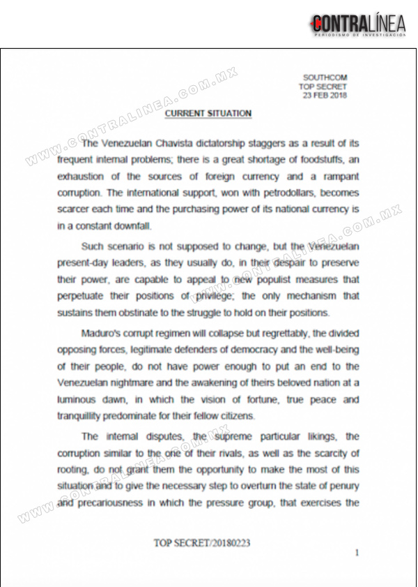 Un documento del Comando Sur revela el diseño de una operación militar estadunidense contra Venezuela, antes de la elección presidencial del 20 de mayo y durante 2018. Basándose en un documento interno del Pentágono, pone al desnudo la implicación de Argentina, Colombia, Brasil, Guyana y Panamá en ese proyecto de derrocamiento del gobierno elegido democráticamente. Es un plan de destrucción de toda una sociedad. Las Fuerzas Armadas de Estados Unidos están de regreso contra los pueblos en Latinoamérica
