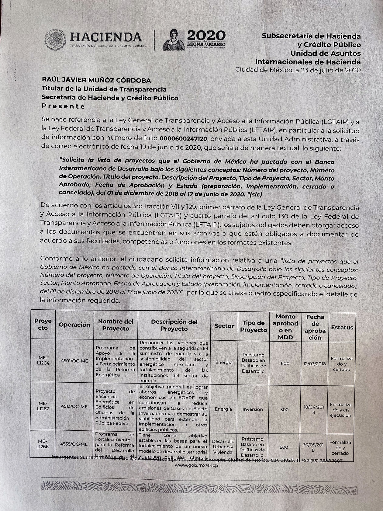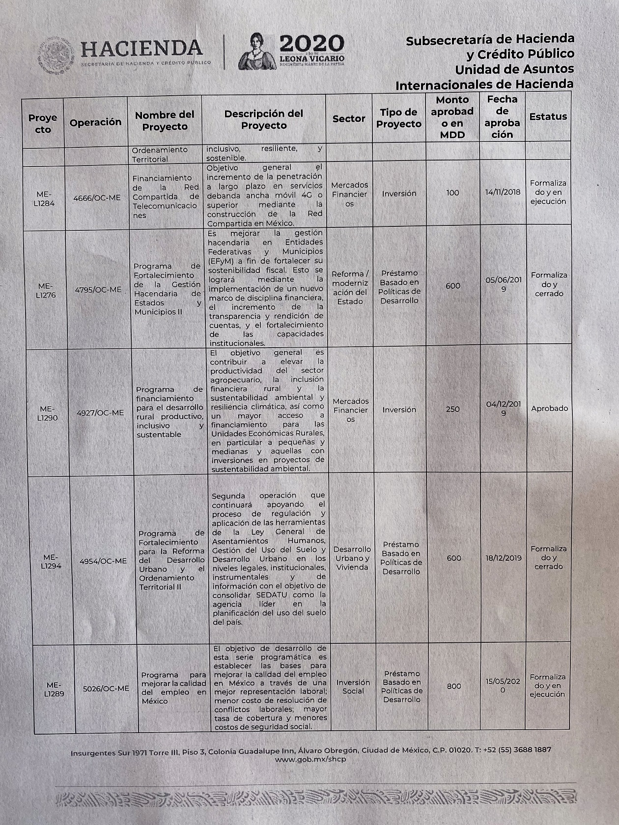 La información entregada a Contralínea, a través del oficio 000600247120, indica que ya en el gobierno del presidente López Obrador se han adquirido compromisos por 2 mil 350 millones de dólares, mediante siete proyectos “formalizados y en ejecución”, a través de los sectores de energía, desarrollo urbano, mercados financieros, “modernización del Estado” e inversión social.