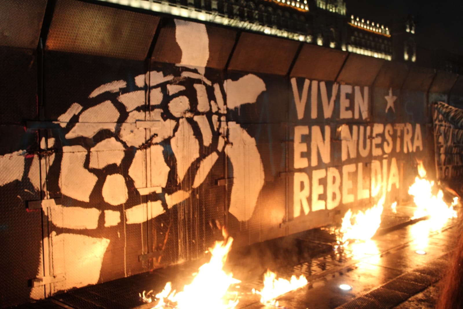 A sus espaldas, grupos de universitarios encapuchados pintan las vallas que separan al contingente del Palacio Nacional. En ellas, escriben un mensaje: Ayotzinapa vive en nuestra rebeldía.