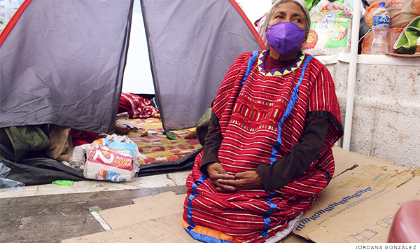 Sentada en una lona blanca que hace de piso en el campamento instalado entre las avenidas Juárez y Eje Central Lázaro Cárdenas, en el Centro Histórico de la capital, exige a los tres niveles de gobierno justicia para su pueblo, poder volver a su hogar y cárcel para los perpetradores del ataque.