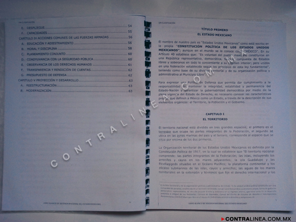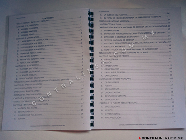 Está integrado por cuatro títulos (“El Estado mexicano”; “Ámbitos de operación para la defensa”; “Visión estratégica”, y “Las Fuerzas Armadas Mexicanas) y 16 capítulos, el último dedicado a la “Proyección y desarrollo”, en el que se abordan las necesidades de modernización y restructuración. Fue elaborado bajo la supervisión directa de los anteriores titulares de la Sedena y la Semar (Salvador Cienfuegos Zepeda y Vidal Francisco Soberón Sáenz, respectivamente).