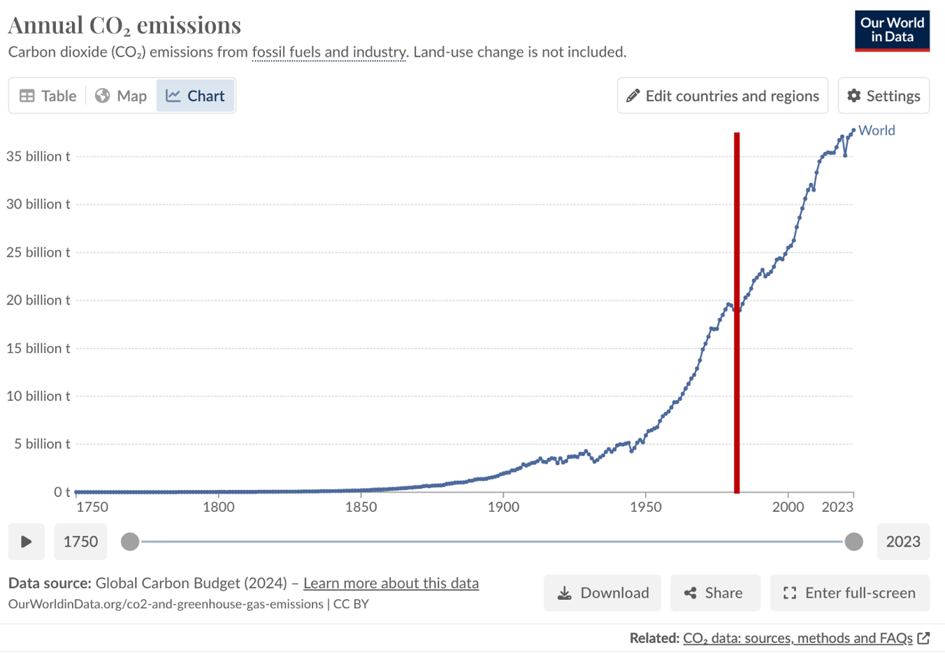 Figura 2. Se han emitido más gases con efecto invernadero desde el comienzo de las Conferencias de las Partes (en donde se toman acuerdos para reducir las emisiones) que en toda la historia humana previa, y las emisiones siguen subiendo. La línea roja representa el año 1992, cuando 154 naciones firmaron la Convención Marco de las Naciones Unidas sobre el Cambio Climático, en donde se comprometieron a “prevenir interferencias antropogénicas peligrosas en el sistema climático de la Tierra” y a “hacer reducciones sustanciales de las emisiones de gases de efecto invernadero”.