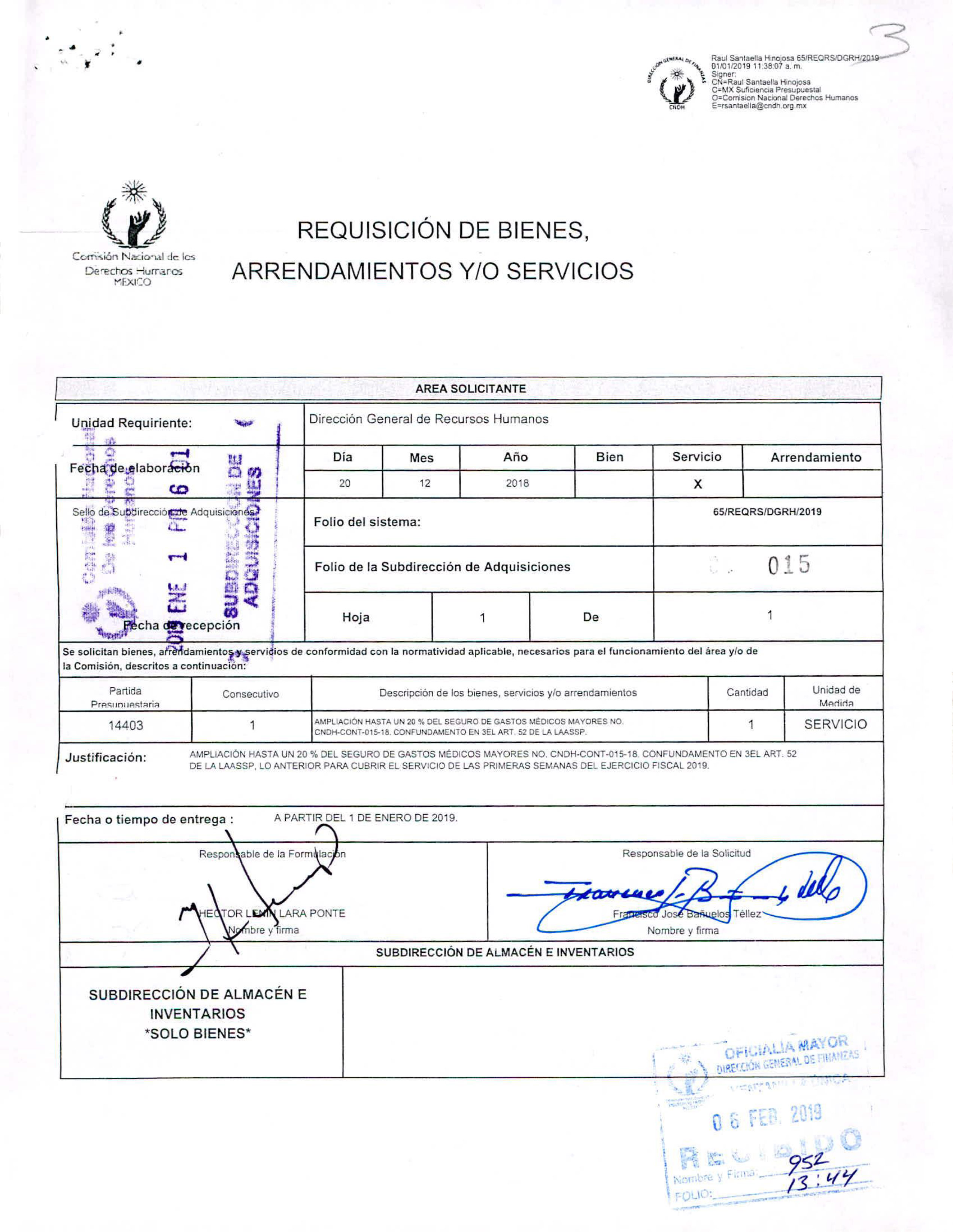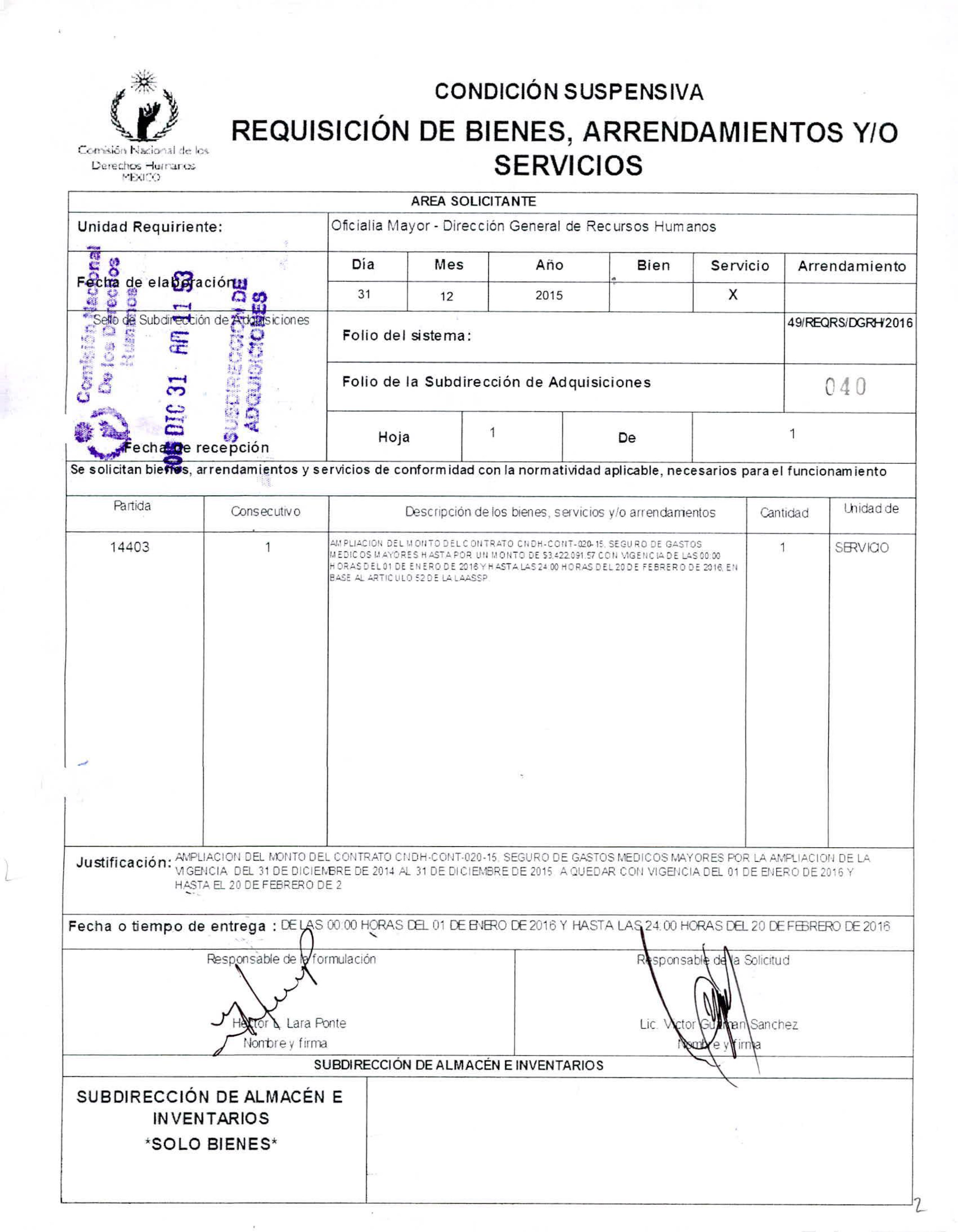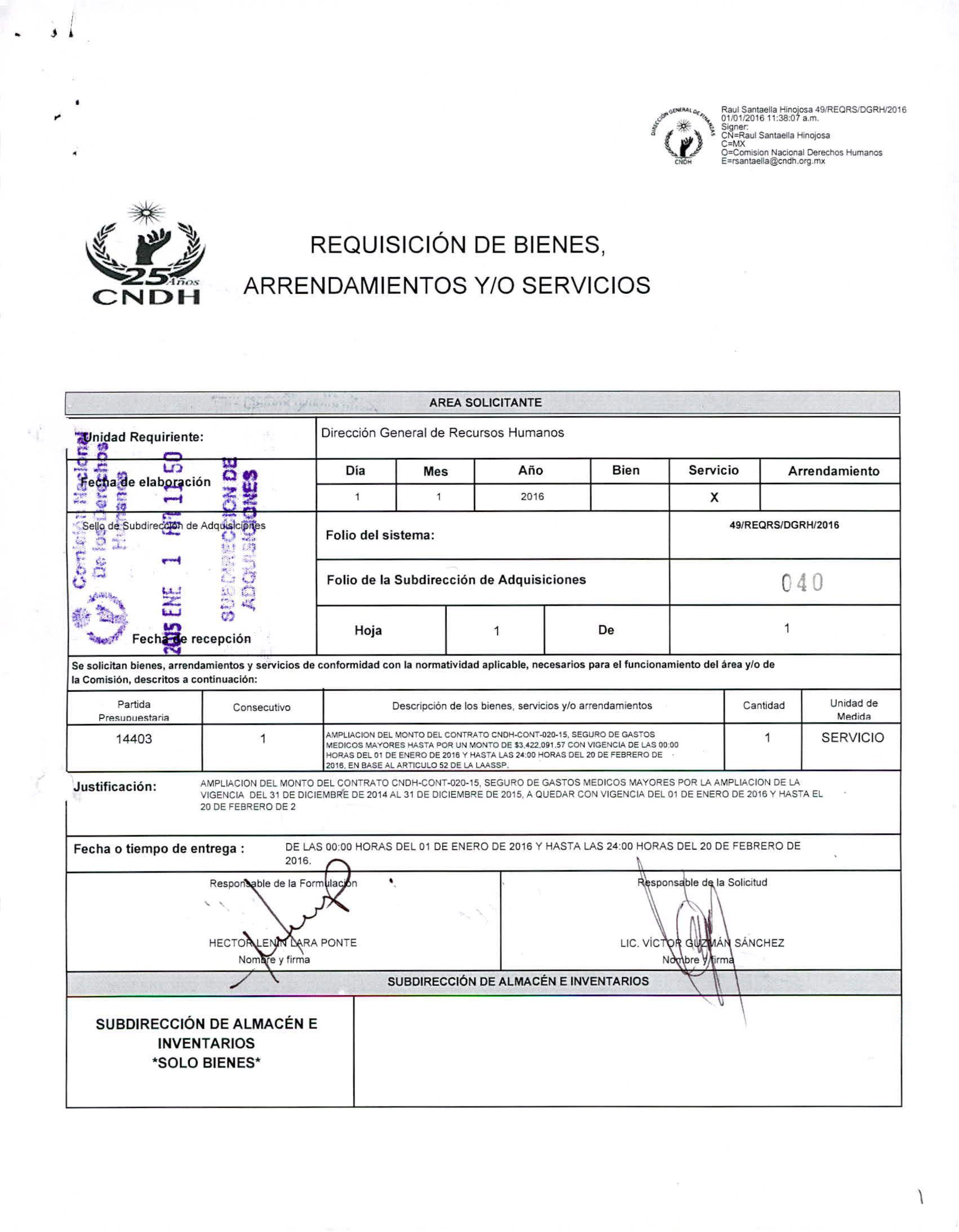 Fechado el 1 de enero de 2016, el documento describe el servicio adquirido: “Ampliación del monto del contrato CNDH-CONT-020-15, seguro de gastos médicos mayores, hasta por un monto de 3 millones 422 mil 91.57 pesos, con vigencia de las 00:00 horas del 1 de enero de 2016 y hasta las 24 horas del 20 de febrero de 2016”. Finalmente, de acuerdo con la misma hoja de Requisición, lo que terminó erogando la CNDH fueron 3 millones 375 mil 511.79 pesos.