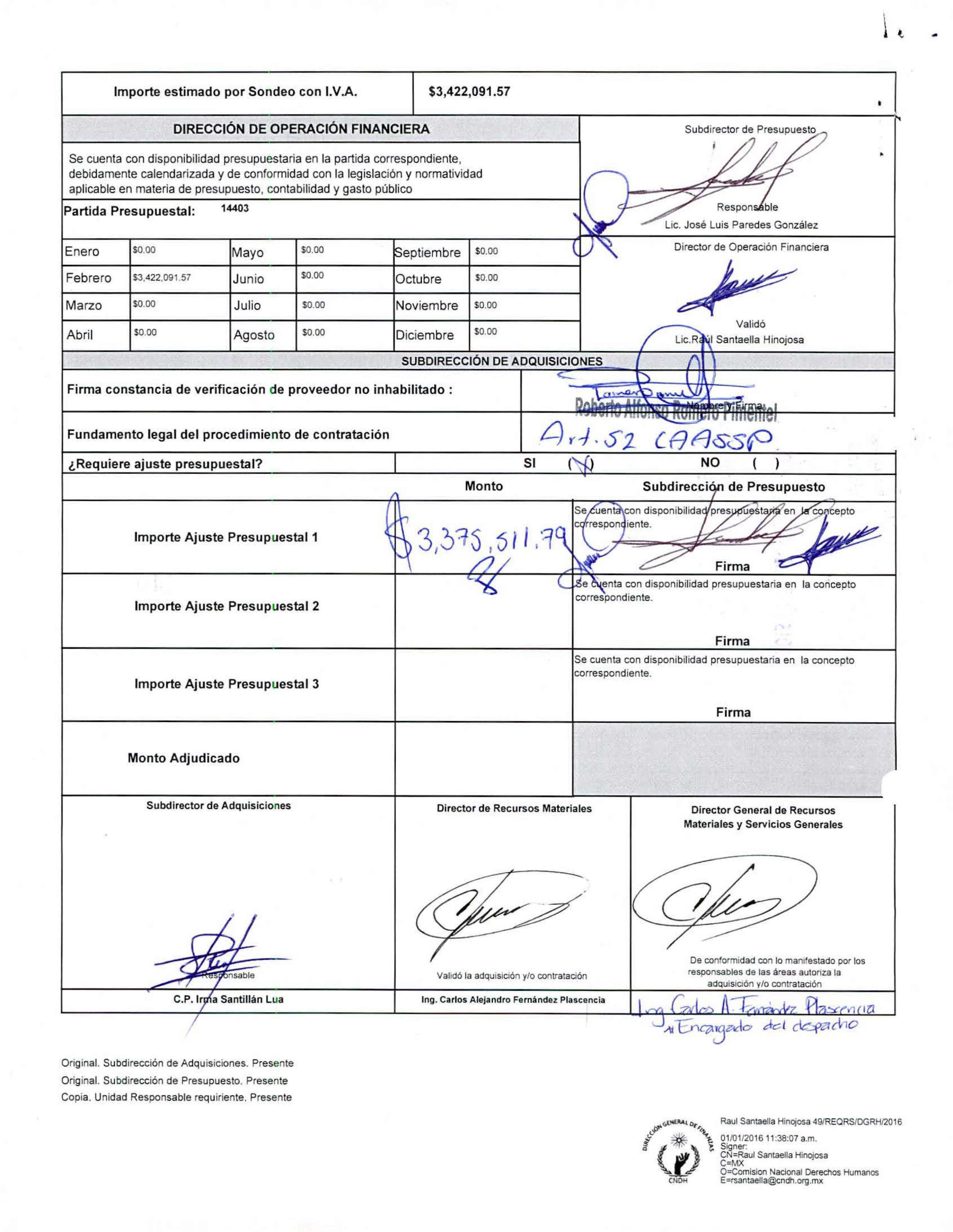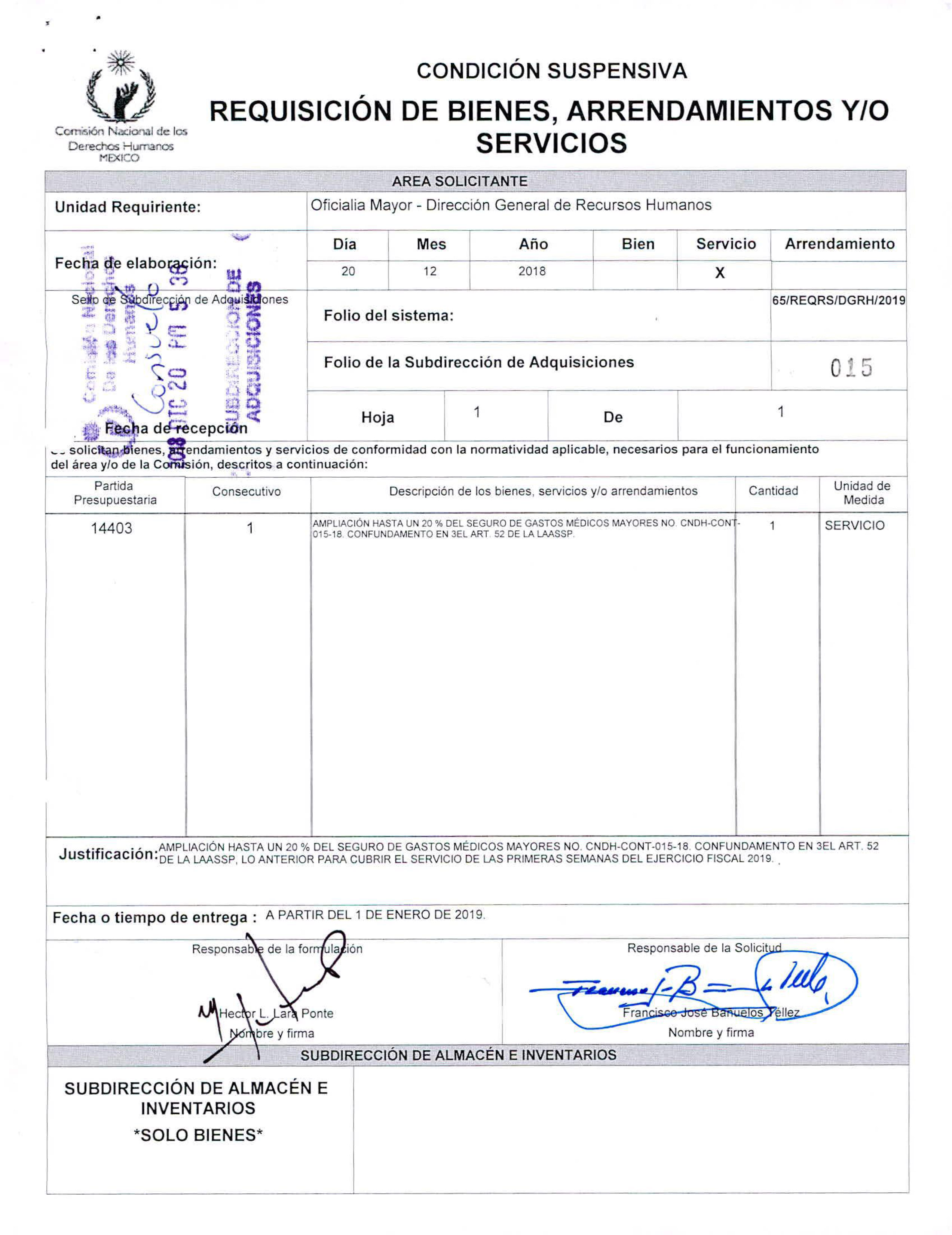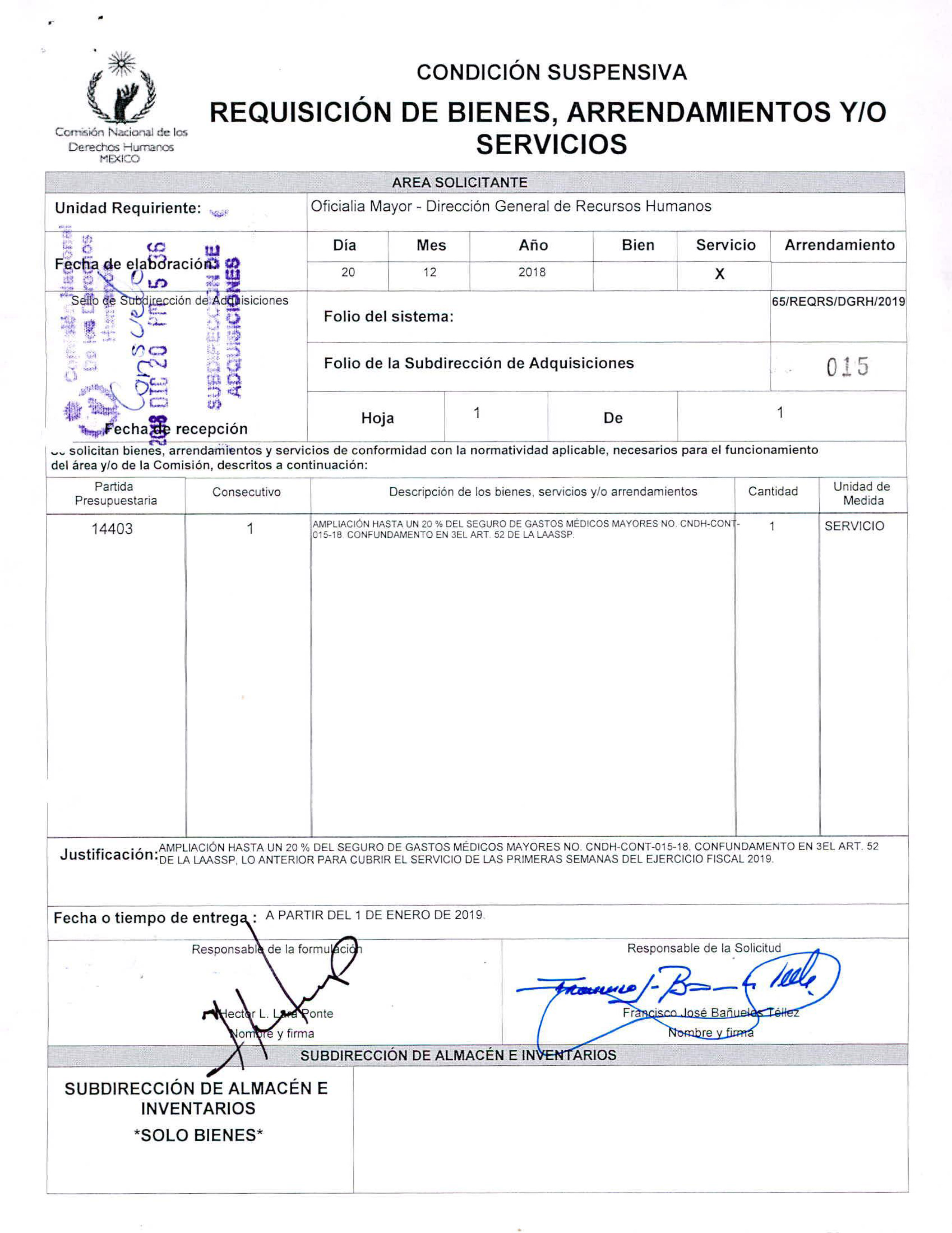 Fechado el 1 de enero de 2016, el documento describe el servicio adquirido: “Ampliación del monto del contrato CNDH-CONT-020-15, seguro de gastos médicos mayores, hasta por un monto de 3 millones 422 mil 91.57 pesos, con vigencia de las 00:00 horas del 1 de enero de 2016 y hasta las 24 horas del 20 de febrero de 2016”. Finalmente, de acuerdo con la misma hoja de Requisición, lo que terminó erogando la CNDH fueron 3 millones 375 mil 511.79 pesos.