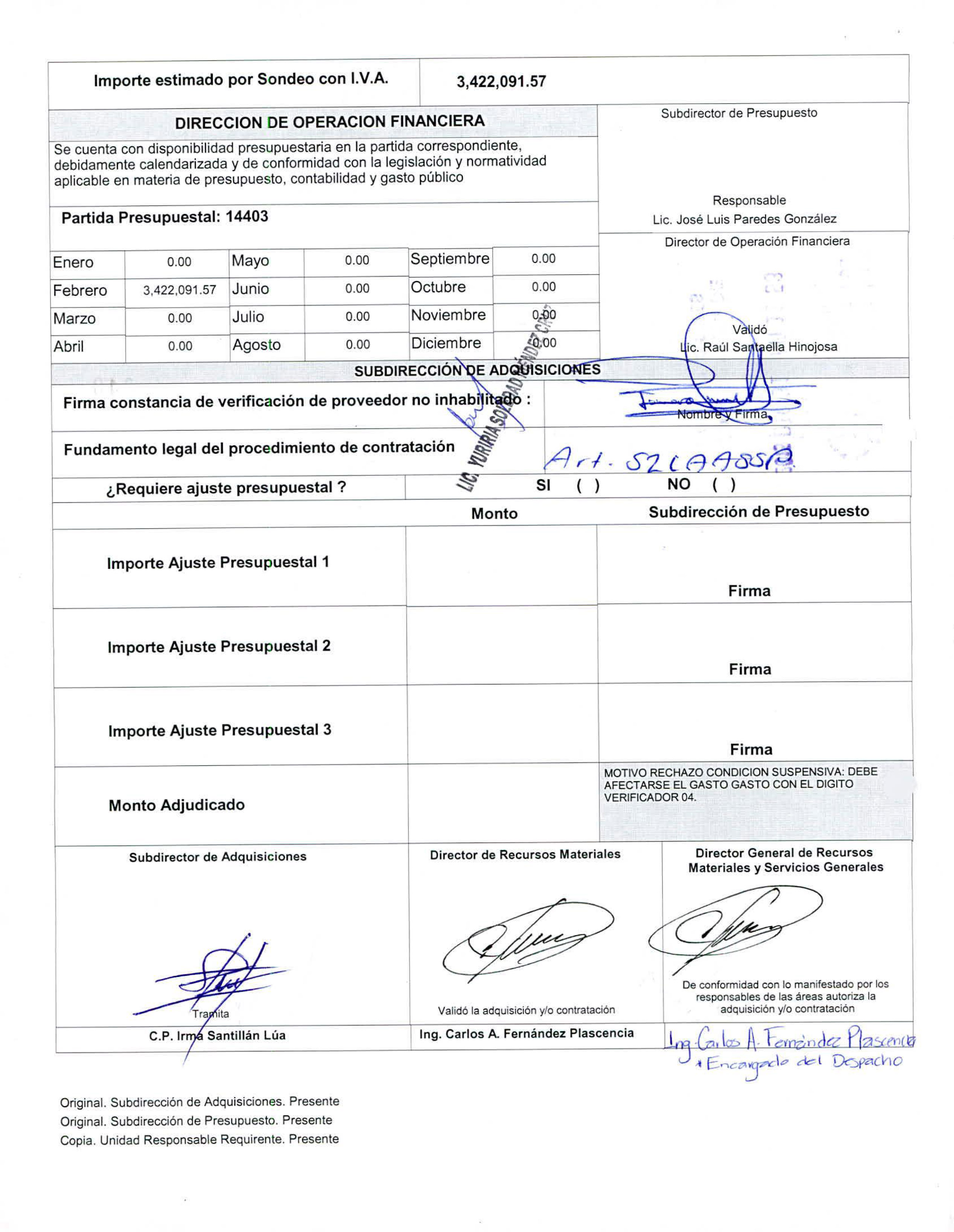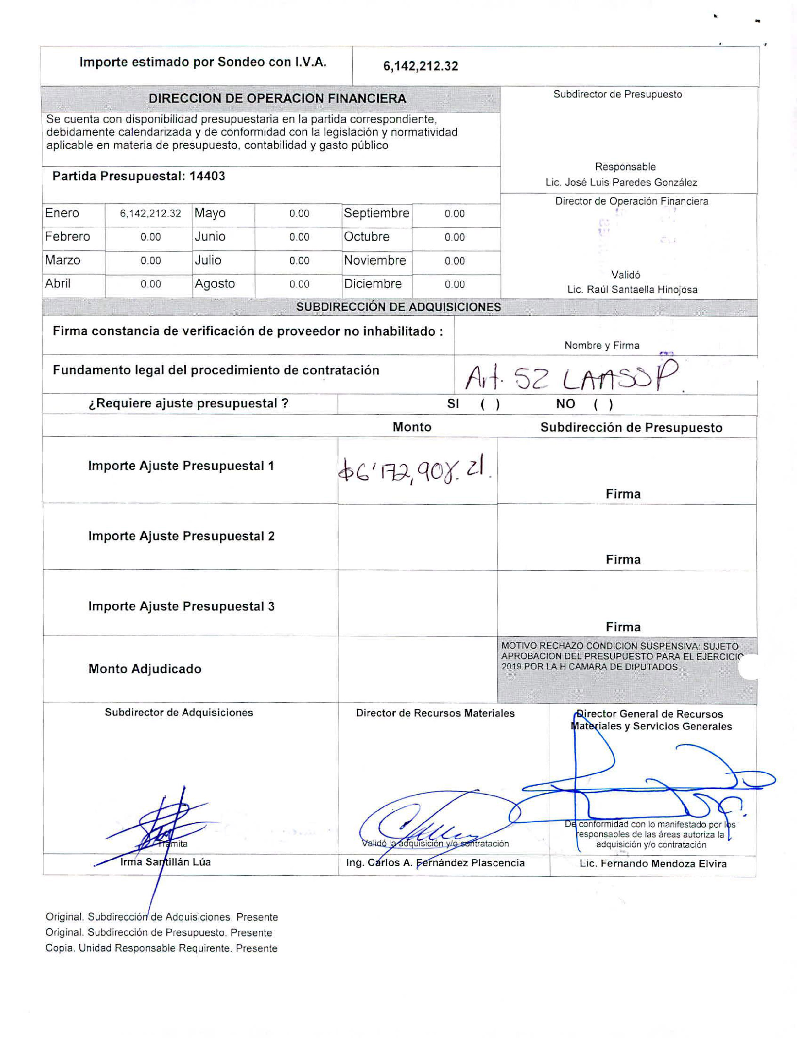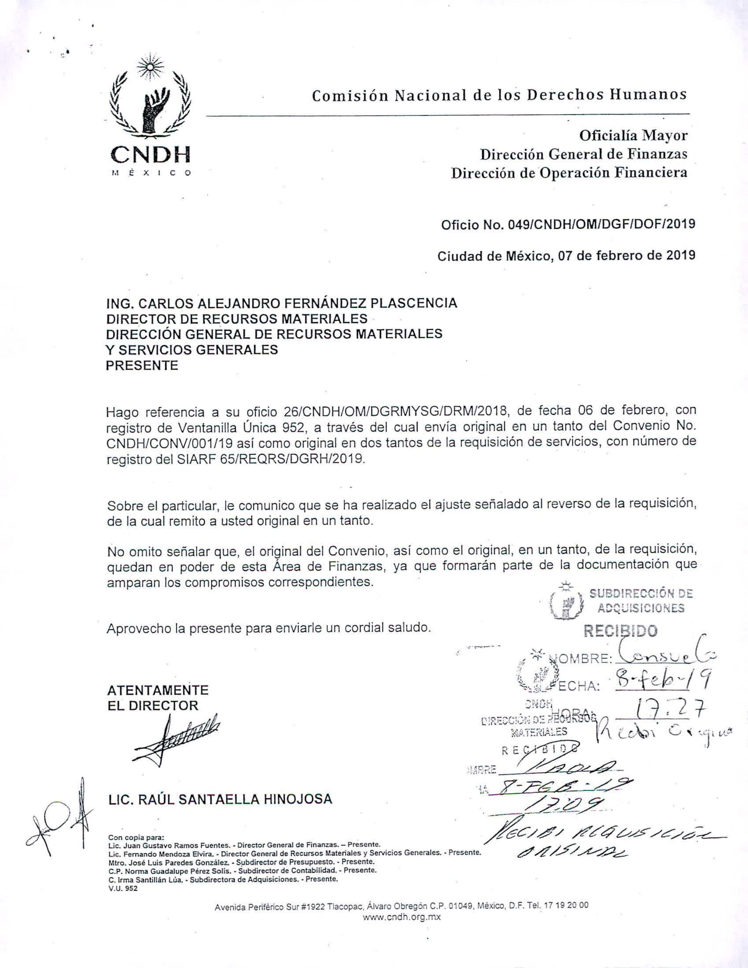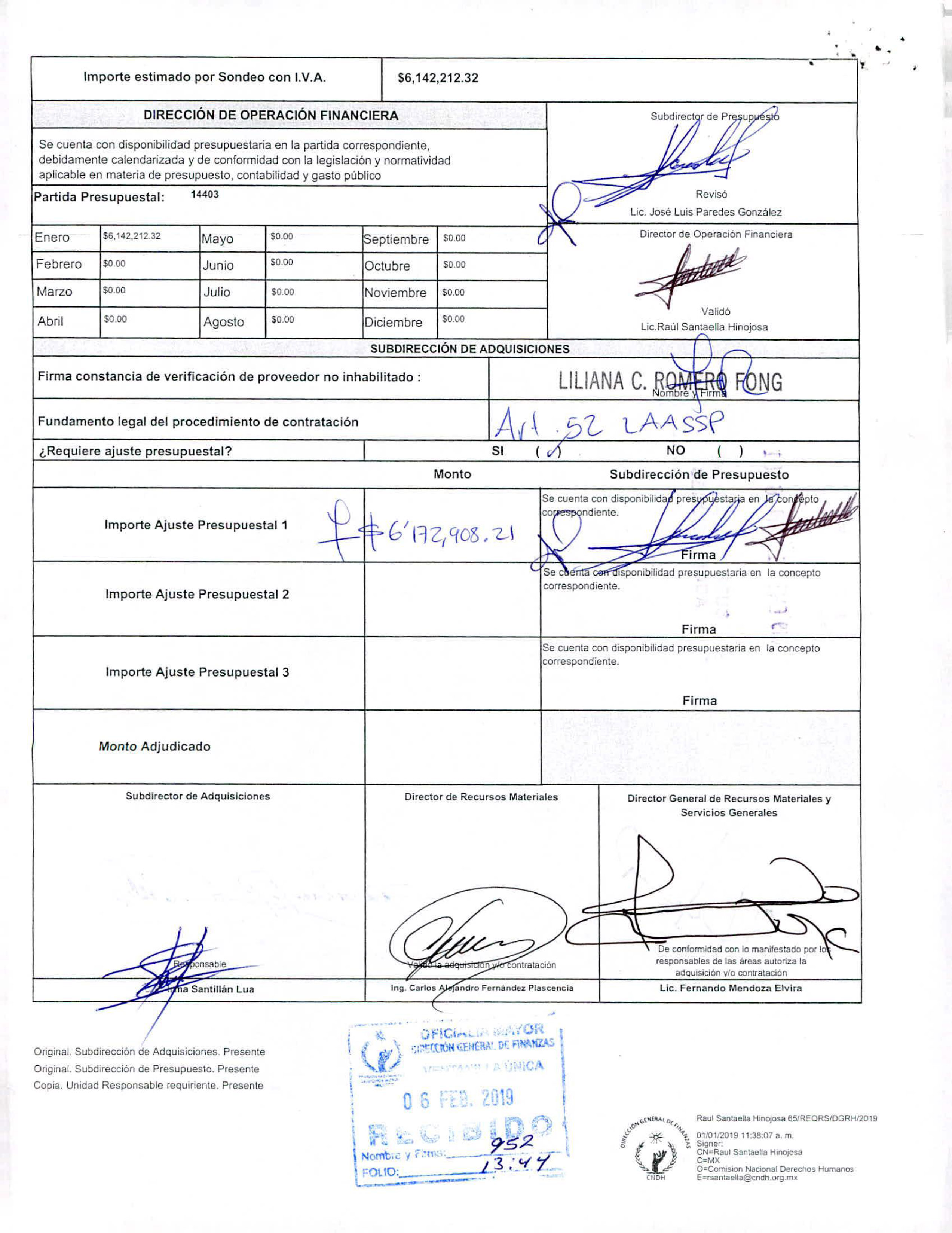 En el documento se asienta que la ampliación implicaría que la CNDH pagara a la aseguradora un monto mínimo de los 2 millones 479 mil 163.28 pesos y hasta un máximo de 6 millones 172 mil 908.21 pesos. La hoja de Requisición de Bienes Arrendamientos y/o Servicios, fechada en febrero de 2019 y firmada por, entre otros funcionarios de la CNDH, el entonces director general de Recursos Materiales y Servicios Generales Fernando Mendoza Elvira, estipula que finalmente el organismos autónomo pagó la cantidad máxima citada.