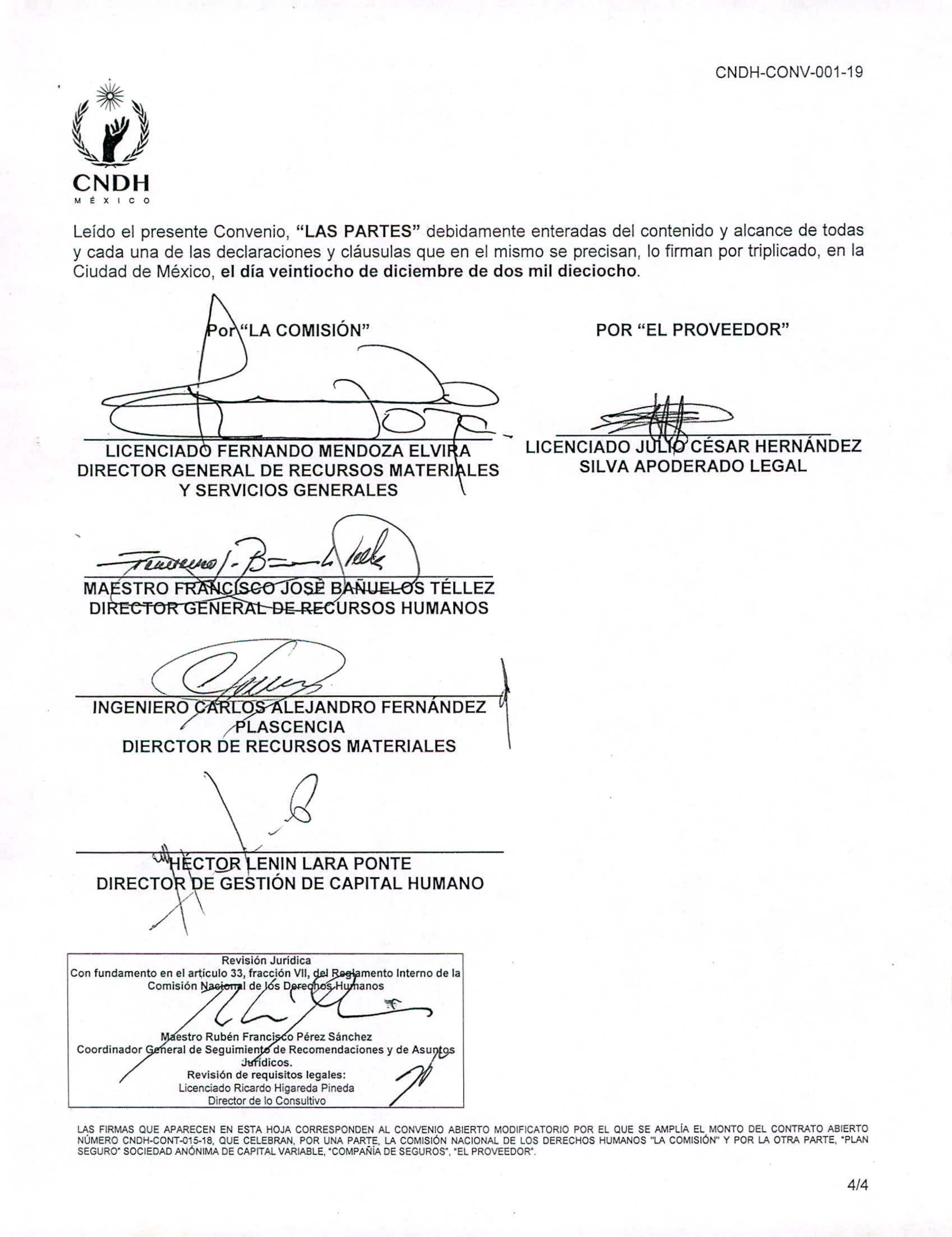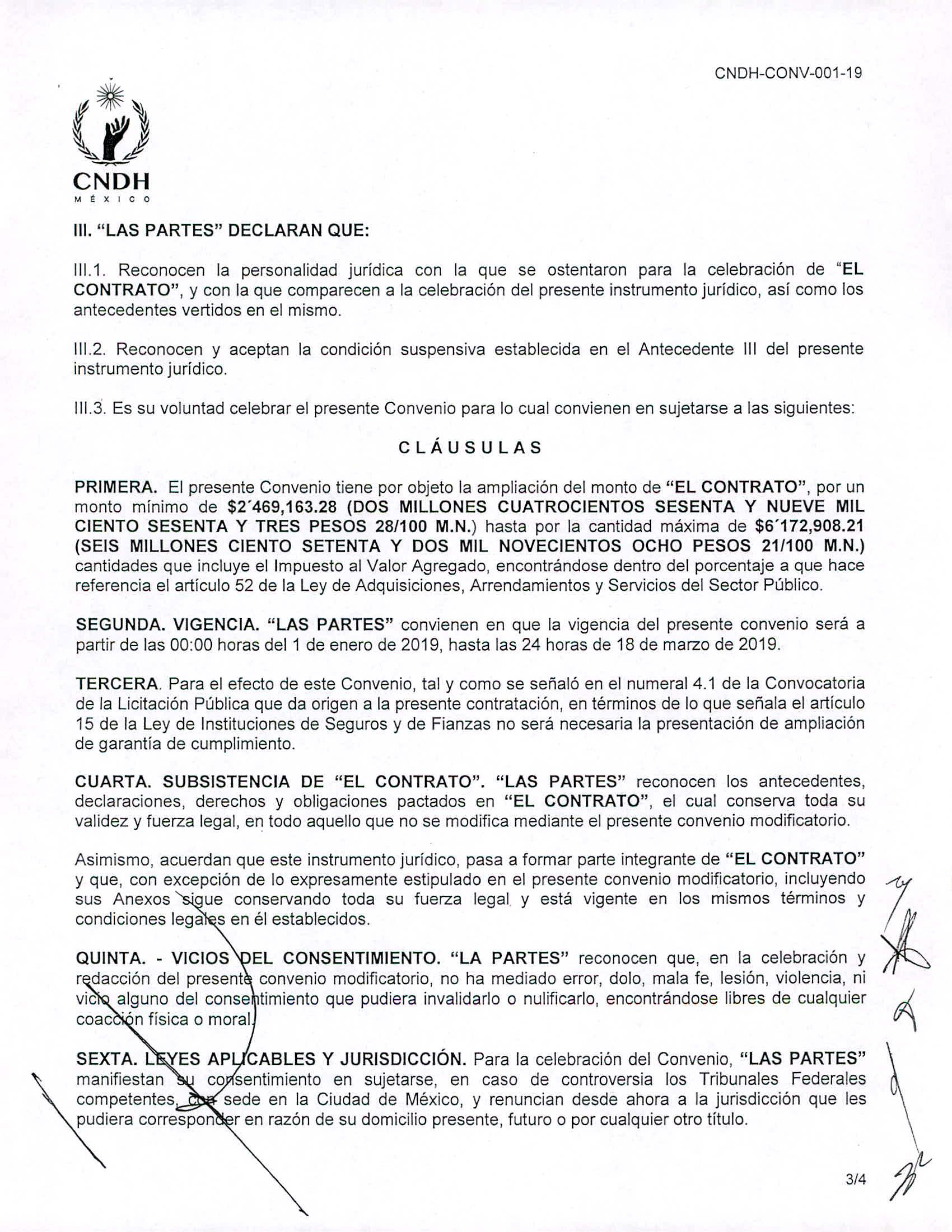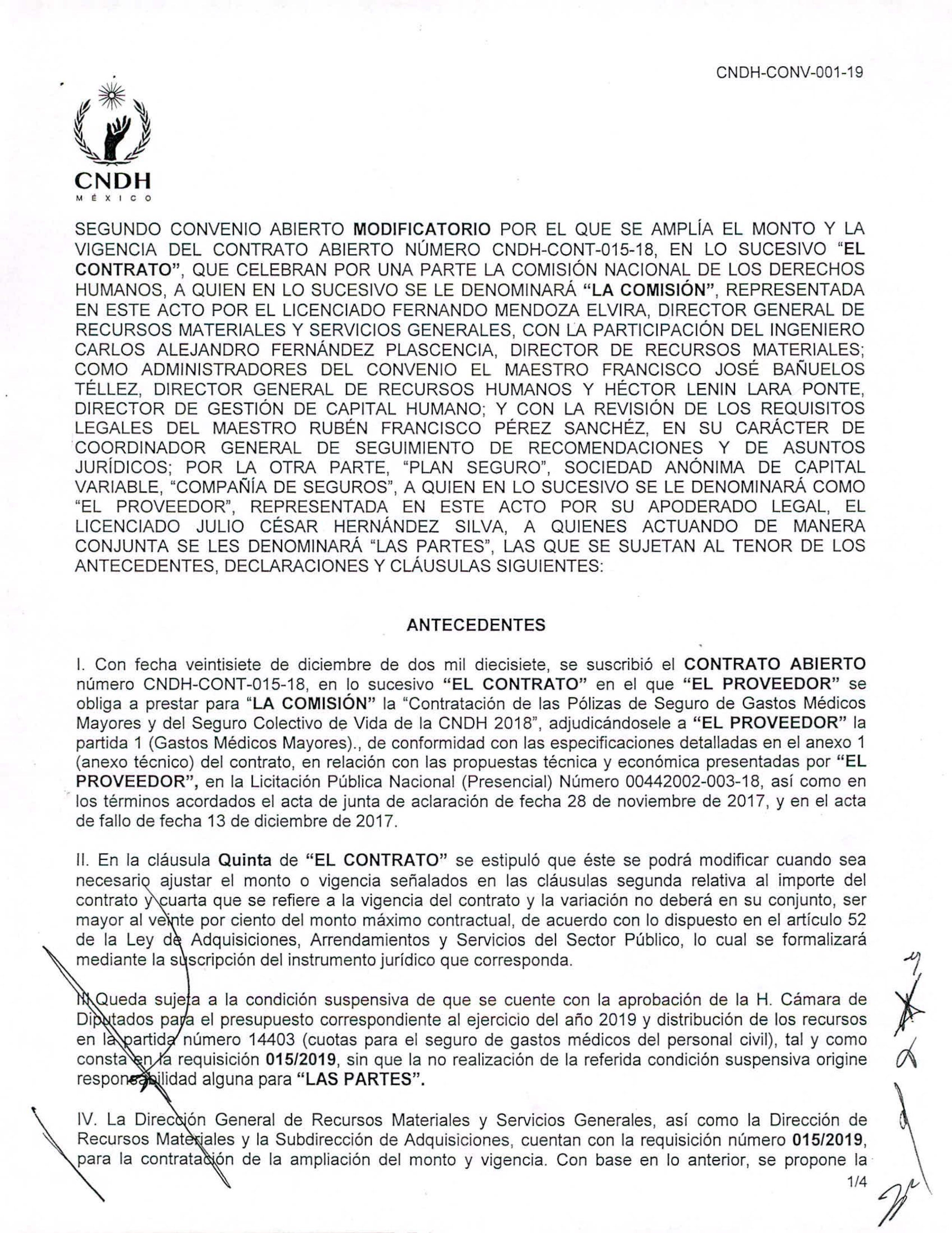 El Segundo Convenio Modificatorio –el único público– señala que el contrato original ampara “la Contratación de las Pólizas de Seguro de Gastos Médicos Mayores y del Seguro Colectivo de Vida de la CNDH 2018” (sic). El convenio, firmado el 28 de diciembre de 2018, amplía la vigencia del contrato del 1 de enero al 18 de marzo de 2019.
