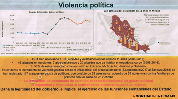 El resultado: “La ola de violencia se incrementó; tan sólo los homicidios registrados entre 2000 y 2017 desbordó cualquier expectativa y derivó en violencia política que ha sido más evidente en los últimos 11 años [2007-2018] con más de 100 asesinatos de alcaldes y políticos de diversas organizaciones partidistas”.