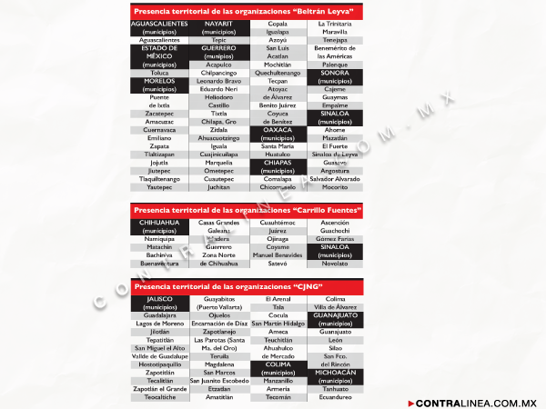 El control territorial del país lo encabeza el Cártel del Pacífico, con cobertura en 14 estados y 145 municipios, de acuerdo con el documento de inteligencia. Es seguido por los Caballeros Templarios (con 13 estados y 103 municipios); Los Zetas (11 y 159); la Familia Michoacana, en ocho estados y 59 municipios; los Beltrán Leyva (45 y nueve); Jalisco Nueva Generación (cuatro entidades y 40 alcaldías); el Golfo (cuatro y 14); Carrillo Fuentes (dos y 19), y Arellano Félix (dos estados y seis alcaldías).
