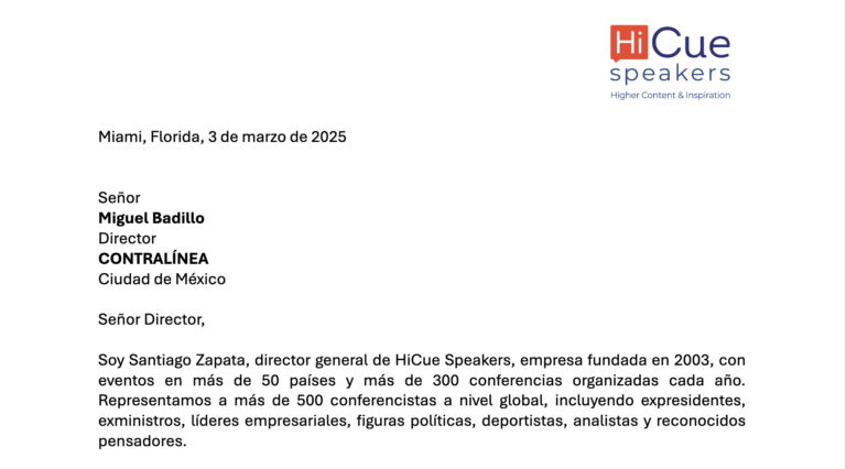Soy Santiago Zapata, director general de HiCue Speakers, empresa fundada en 2003, con eventos en más de 50 países y más de 300 conferencias organizadas cada año. Representamos a más de 500 conferencistas a nivel global, incluyendo expresidentes, exministros, líderes empresariales, figuras políticas, deportistas, analistas y reconocidos pensadores.