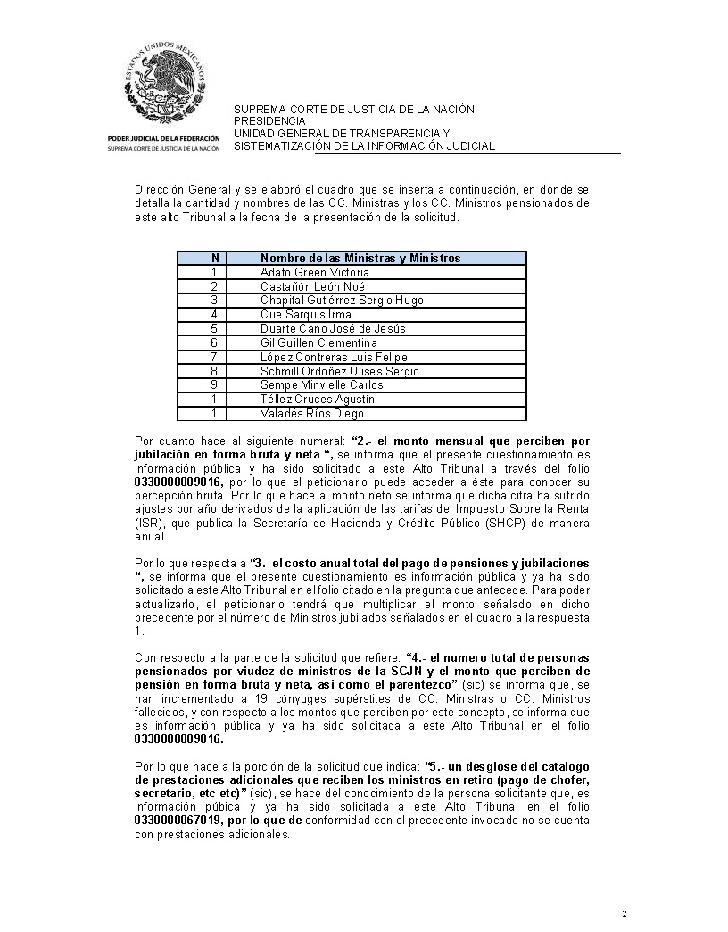 La lista de los beneficiarios de las pensiones vitalicias puede ser mucho mayor, pues otras dos respuestas de la Suprema Corte de Justicia de la Nación (a las solicitudes 0330000051521, de abril de 2021, y olio 0330000009016, de junio de 2016) refieren 23 nombres de ministras y ministros en retiro –algunos, adicionales a los anteriores–, de los cuales 13 ya estaban fallecidos, pero se les sigue o seguía pagando a las viudas: