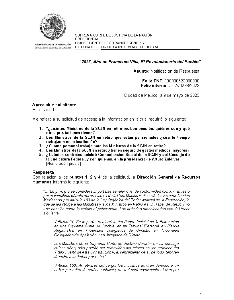 Pero en la respuesta a la solicitud 330030523000800, de mayo de 2023, la Suprema Corte asegura que son nueve, ninguno de los cuales coincide con la lista anterior:
