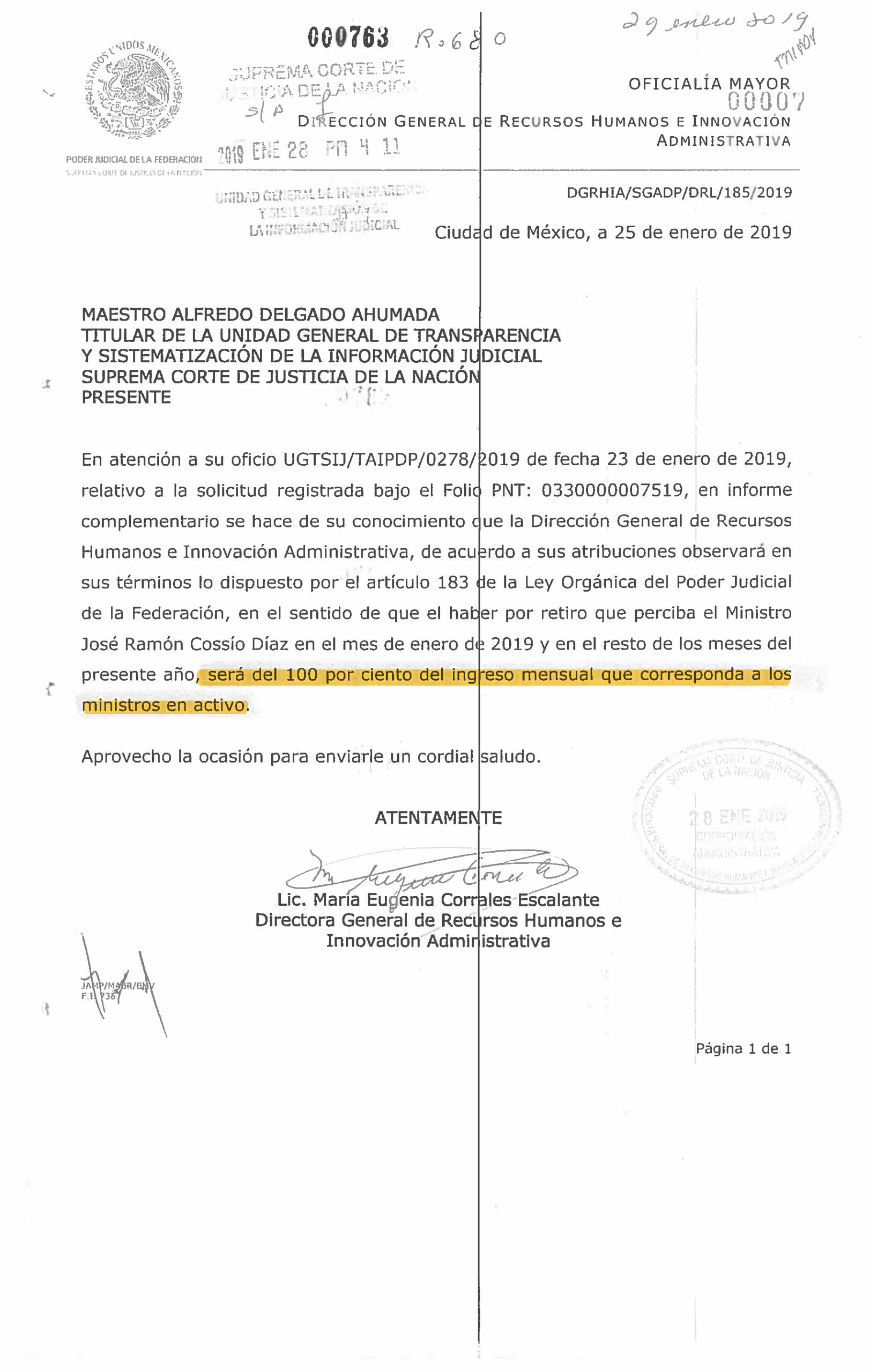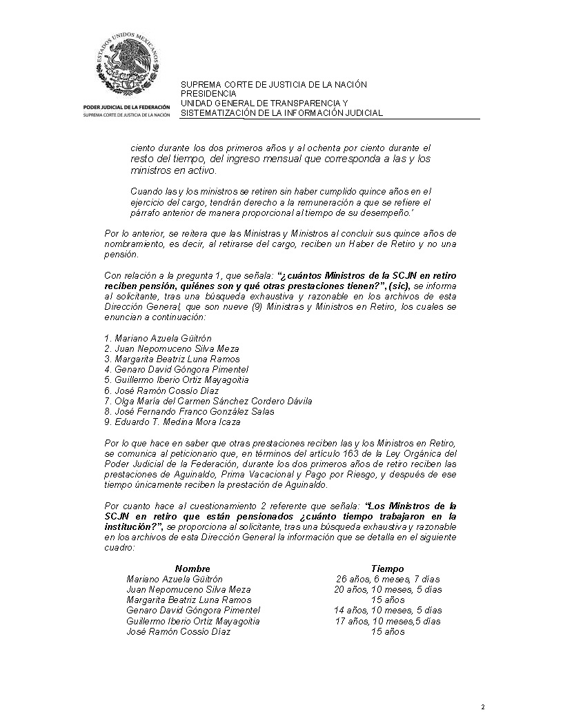 Pero la cifra podría ser mayor, si se tienen en cuenta los nombres de ministras y ministros en retiro que figuran adicionalmente en las otras dos listas. Y tampoco los montos quedan claros, pues en la respuesta a la solicitud de información 0330000007519 –de enero de 2019– se refiere que en el caso de José Ramón Cossío, su haber de retiro en ese mes y en el resto de los meses de ese año, sería “del 100 por ciento del ingreso mensual que corresponda a los ministros en activo”.