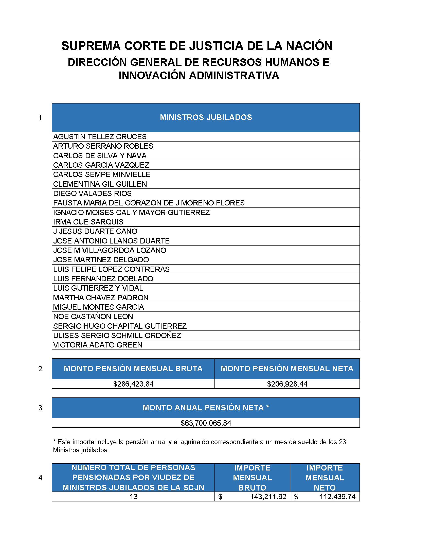 Cada año, la Suprema Corte de Justicia de la Nación destina más de 60 millones de pesos del erario al pago de pensiones vitalicias. Hay, al menos, 32 ministras y ministros en retiro (13 de esas pensiones se paga a las viudas) que cobran su haber de retiro mensual por 286 mil pesos, más un mes adicional por aguinaldo. Entre los beneficiarios están Diego Valadés Ríos –quien sólo se desempeñó cuatro meses como ministro–; Eduardo Medina Mora Icaza, quien habría salido de la SCJN por un expediente de presunta corrupción en su contra, que incluía una revisión a su situación financiera no acorde con sus ingresos –y que sólo laboró como ministro 4 años–; así como el caso de José Ramón Cossío, abierto opositor a la actual administración. El tema de una posible cancelación de estos haberes de retiro podría incluirse en la próxima discusión legislativa sobre la reforma judicial