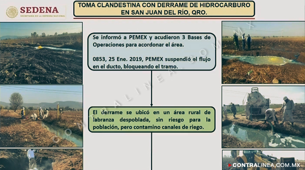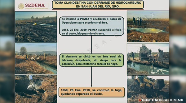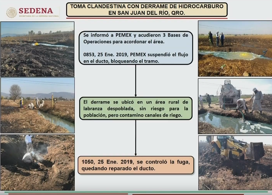 El ducto Tuxpan-Azcapotzalco es el que más tomas clandestinas, 636. De éstas, 184 ya fueron localizadas, 281 permanecen como no localizadas y 171 no fueron reportadas por Pemex pero el Ejército las encontró.