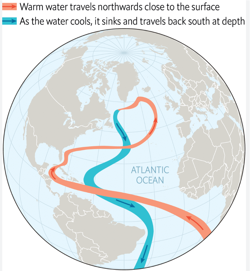 El AMOC es un sistema de circulación oceánica en donde el agua superficial caliente de los trópicos fluye hacia el norte geográfico y libera su calor en el Atlántico subpolar, al sur de Groenlandia y al oeste de Gran Bretaña e Irlanda. Después se enfría y se hunde a una profundidad de entre 2 mil y 3 mil metros antes de volver al sur como una corriente fría. El AMOC mueve una energía 50 veces mayor que el consumo humano mundial de energía, y es uno de los mayores sistemas de transporte de calor del planeta. El AMOC influye fuertemente sobre los patrones de lluvia de la región tropical, sobre el clima de Europa, y regula cuánto CO2 captura el océano.