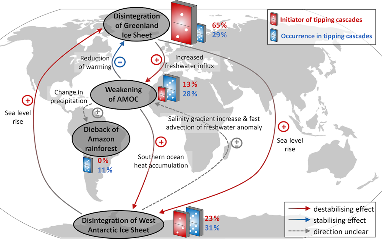 Debemos mantener el calentamiento global lo más abajo posible, porque entre más calentamos la tierra, más probable es cruzar puntos de inflexión, puntos de quiebre o puntos de no retorno. El punto de inflexión es el momento a partir del cual una perturbación genera un proceso imparable e irreversible en un sistema. Muchos sistemas climáticos y biológicos tienen puntos de quiebre, entre ellos las capas de hielo de Groenlandia, las del Oeste de la Antártida, la selva del Amazonas y las corrientes de circulación marinas. Uno de estos sistemas es el AMOC, o la circulación de vuelco meridional del atlántico, por sus siglas en Inglés.