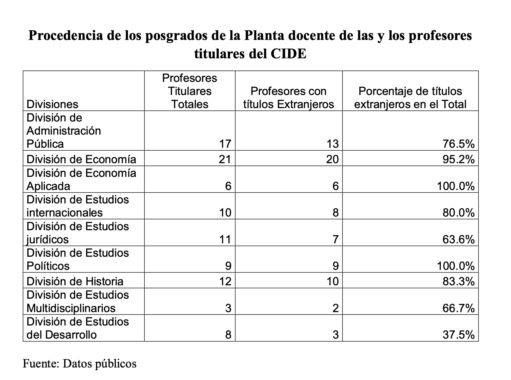 En el caso del CIDE, y de acuerdo con sus propios datos, la configuración de su cuerpo docente titular, revela “una marcada inclinación hacia la formación en el extranjero, con porcentajes que en ciertas áreas alcanzan la totalidad del profesorado formado fuera de México”. Ello, con base en un análisis del origen de sus títulos de posgrado y el desglose por divisiones académicas.