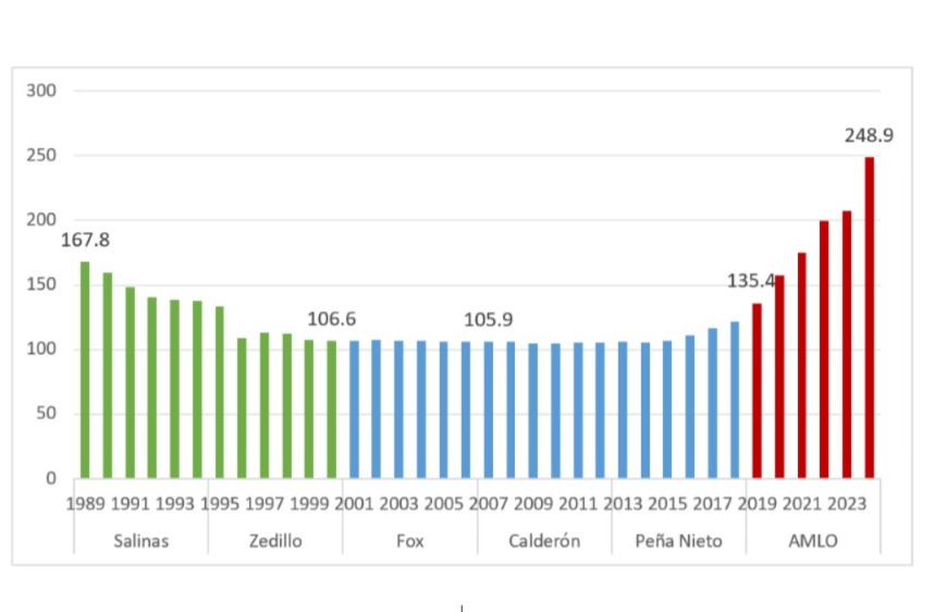 Cuando el expresidente Andrés Manuel López Obrador llegó a la Presidencia en diciembre de 2018, un trabajador promedio ganaba 135.4 pesos diarios; al término de su sexenio, en septiembre de 2024, el salario mínimo se ubicó en 248.9 pesos (a precios de agosto de 2024, esto es, sin la inflación). En todo el sexenio de Enrique Peña Nieto se aplicó un incremento salarial de apenas 15.6 pesos. De los gobiernos anteriores, desde Carlos Salinas hasta Felipe Calderón, el incremento fue pulverizado por la inflación y se estancó, o para decirlo en otras palabras, se aplanó la curva salarial para la clase trabajadora, como se muestra en la gráfica 1.