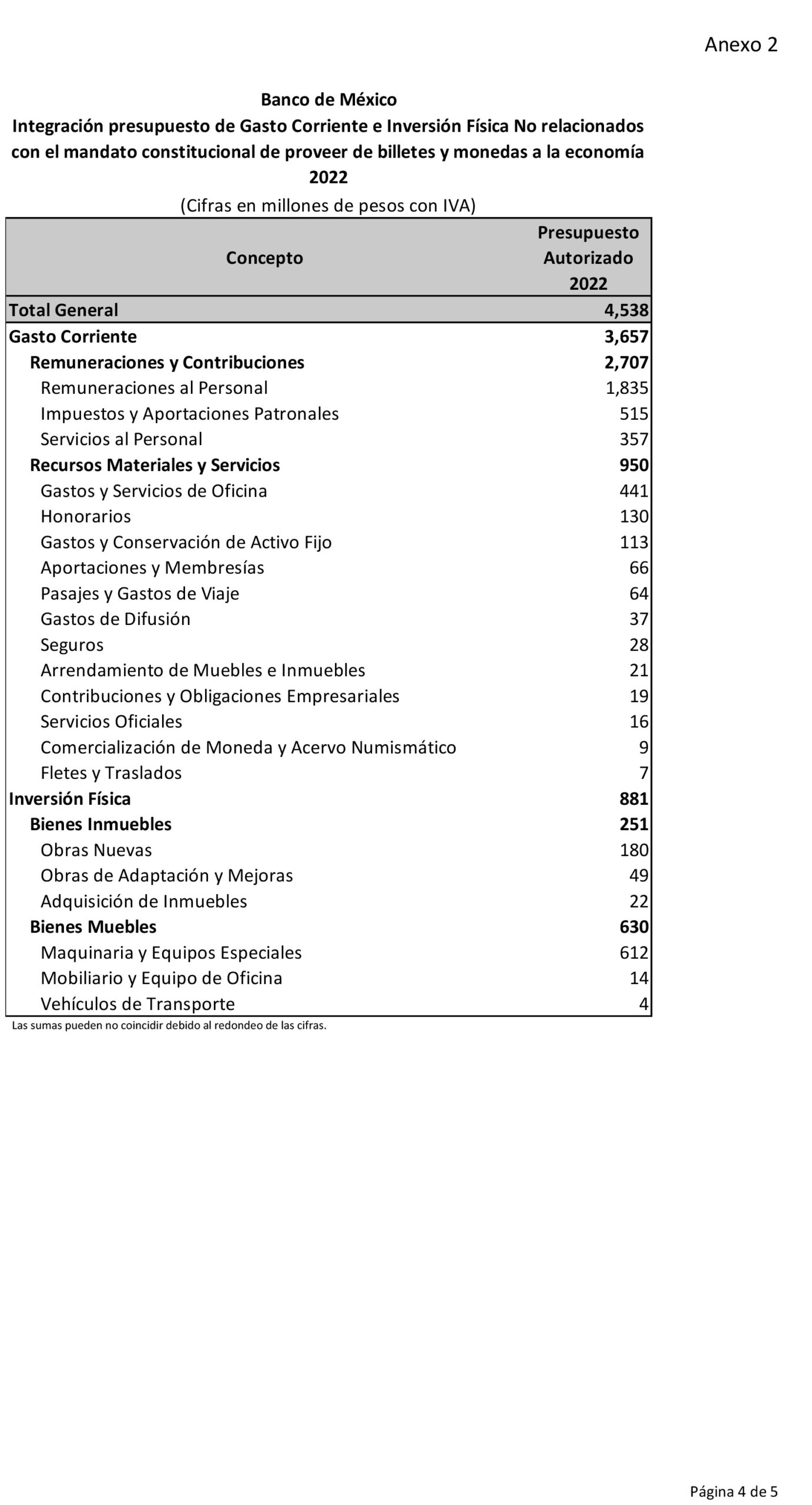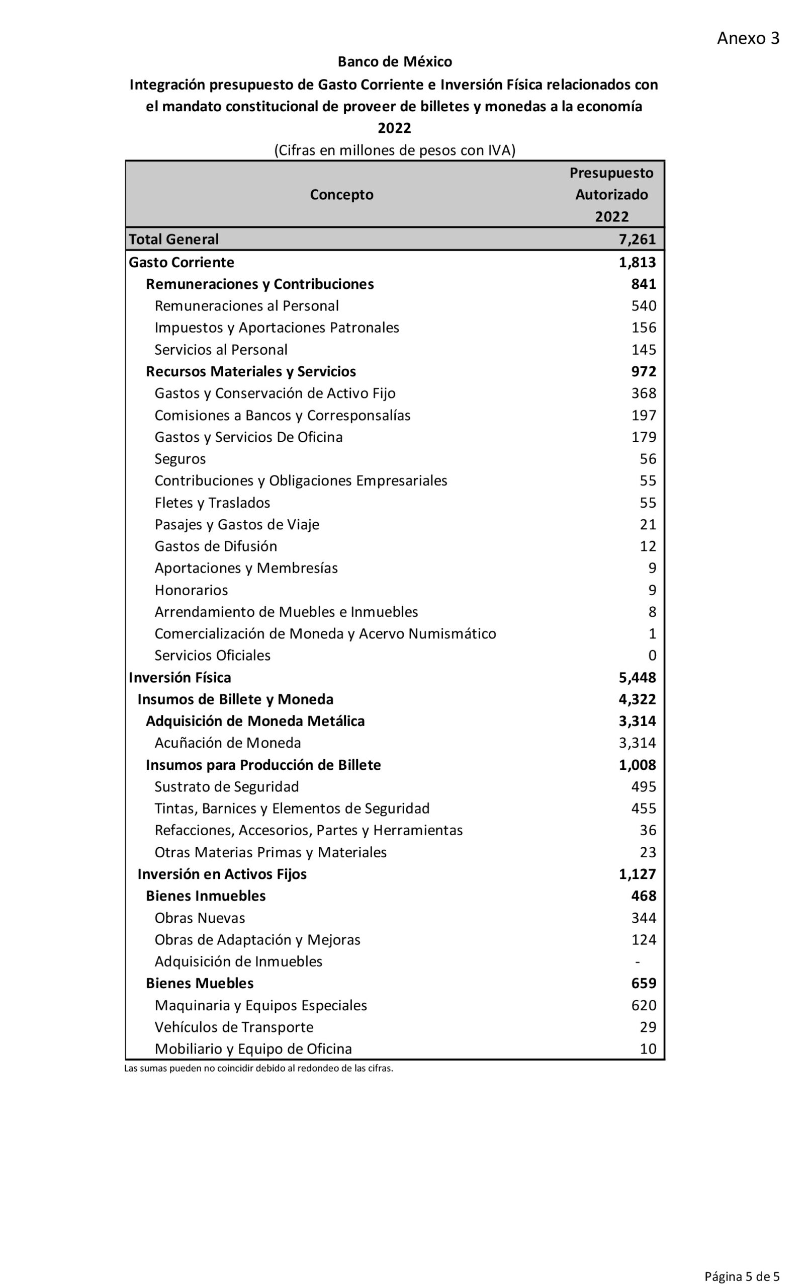 Adicionalmente, en su reporte “Integración presupuesto de gasto corriente e inversión física relacionados con el mandato constitucional de proveer de billetes y monedas a la economía 2022”, indica un gasto de 540 millones de pesos en remuneración al personal, y de 8 millones en honorarios.