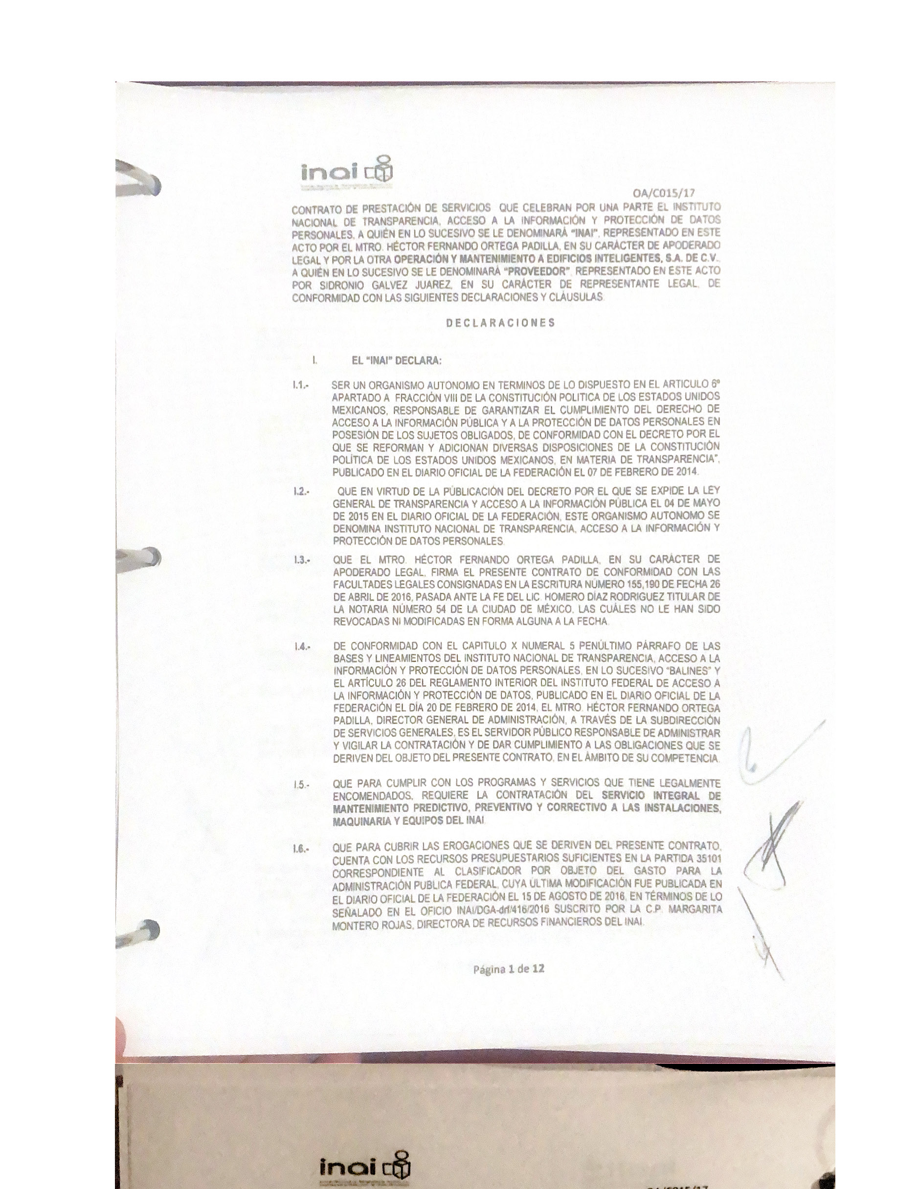 El OA/C015/19, con vigencia del 1 al 31 de marzo de ese año, para el “servicio integral de mantenimiento predictivo, preventivo y correctivo a las instalaciones, maquinaria y equipos del Inai por un monto mínimo de 1 millón 480 mil pesos y un monto máximo de 3 millones 700 mil pesos.