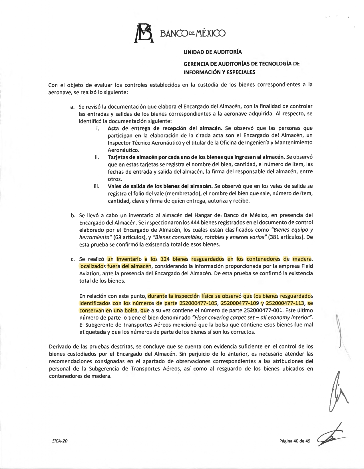 Es más, durante la inspección física, observaron que entre esos bienes del Banxico fuera de almacén había algunos en una bolsa de plástico: “los bienes resguardados identificados con los números de parte 252000477-105, 252000477-109 y 252000477-113, se conservan en una bolsa, que a su vez contiene el número de parte 252000477-001. Este último número de parte lo tiene el bien denominado ‘Floor covering carpet set-all economy interior’ [juego de alfombras para revestimiento de pisos]”. Al respecto, el subgerente de Transportes Aéreos afirmó a los auditores que la bolsa fue mal etiquetada, aunque reconoció que los números de parte de los bienes sí eran los correctos.