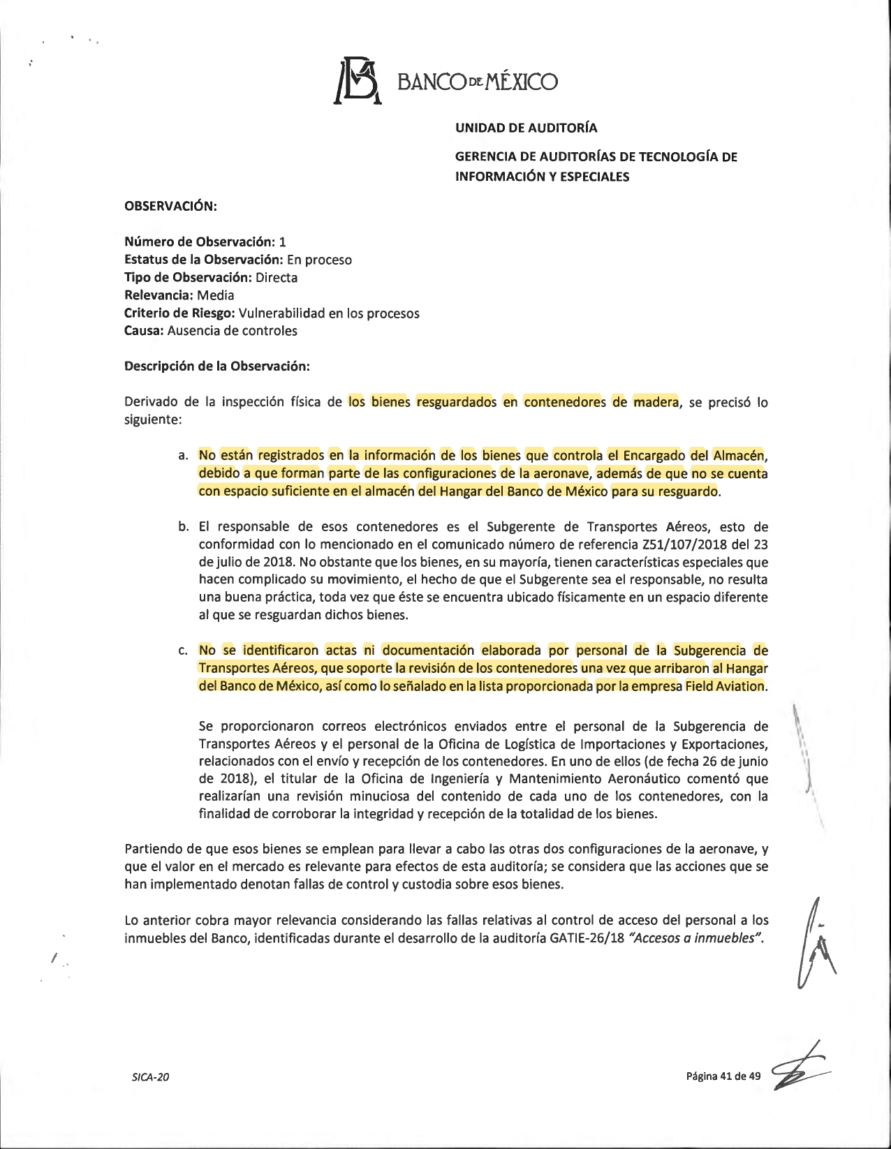 Ante estas vulnerabilidades, los auditores solicitaron a la Dirección General de Emisión del Banxico verificar todos los bienes resguardados en los contenedores de madera, para validar que correspondían con lo señalado por Field Aviation, así como proceder a su registro.
