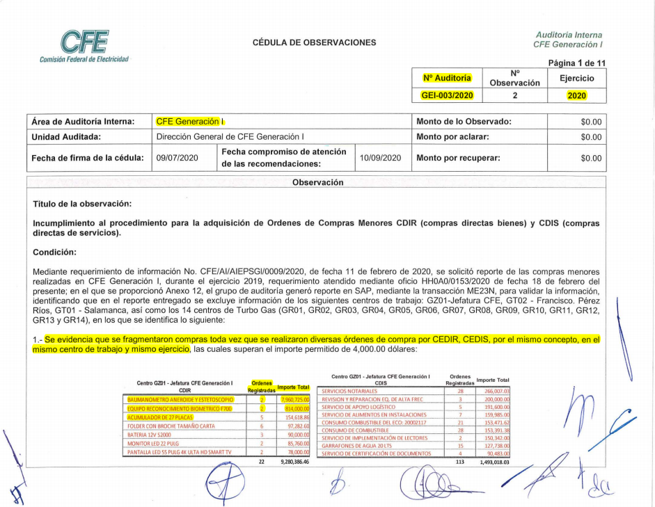 El documento de 90 fojas descubre que, con ello, se incumple el procedimiento para la adquisición de órdenes de compras menores CDIR (compras directas de bienes) y CDIS (compras directas de servicios). El hallazgo se dio en la filial CFE Generación I, y correspondió a una muestra relativa a adquisiciones lo mismo de insumos médicos, televisiones y otros productos que servicios notariales, alimentación y garrafones de agua.