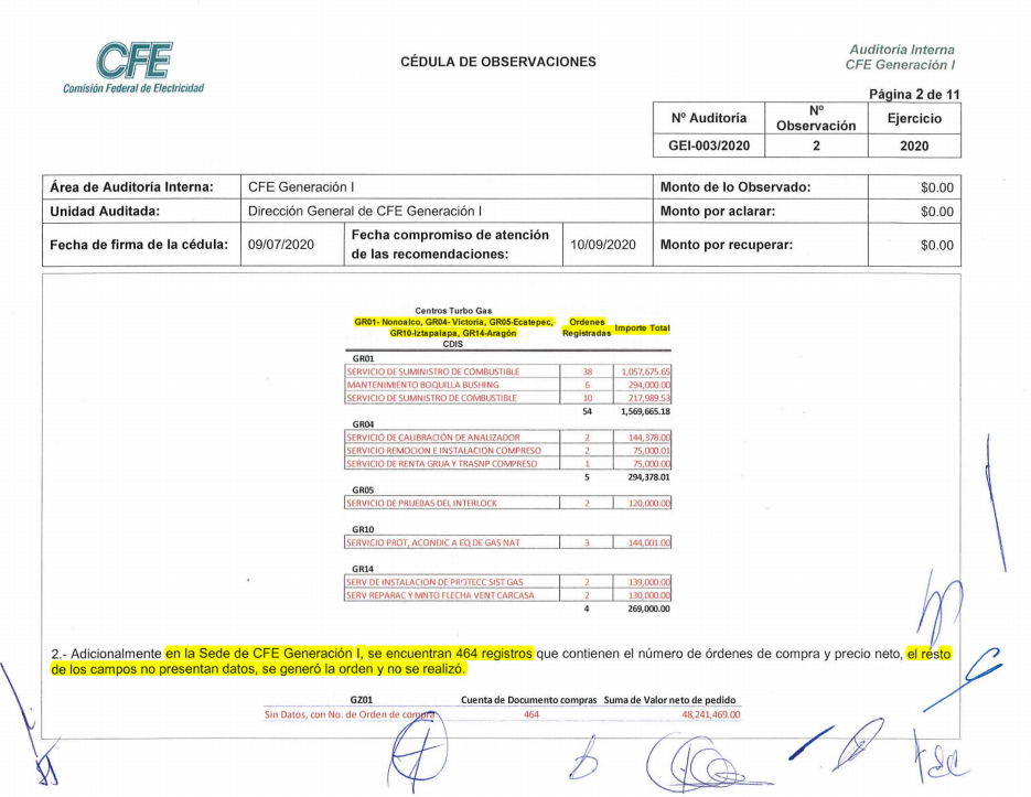 Adicionalmente, el Comité de Auditoría observó que “en la sede de CFE Generación I se encuentran 464 registros que contienen el número de órdenes de compra y precio neto, el resto de los campos no presentan datos, se generó la orden y no se realizó”. Al respecto, revela que el monto comprometido asciende a 48 millones 241 mil 469 pesos.