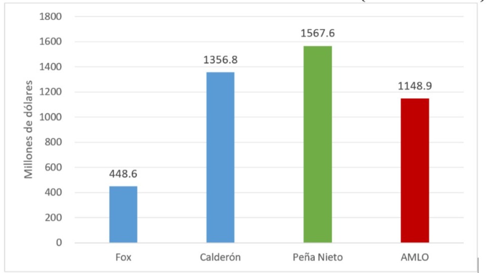 A partir de 2007, EU financió varios programas que fueron definidos como prioritarios y que están en rubros como gobernabilidad, crecimiento económico, educación, infraestructura, entre otros. Según datos de Foreign Assistance (actualizados el 26 septiembre de 2024), en los últimos cuatro sexenios, fue el de Enrique Peña Nieto (2013-2018) el que recibió más asistencia económica o para el desarrollo (ver Gráfica 1).