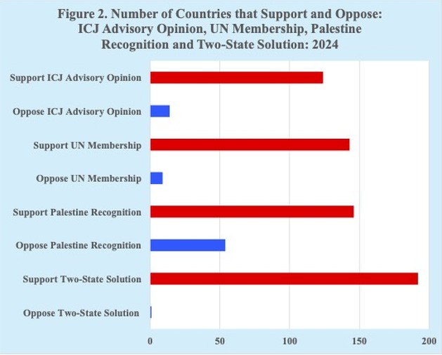 Aunque no se ha convertido en miembro pleno de la ONU, a mediados de 2024, Palestina ha sido reconocida oficialmente como estado soberano por 146 países, que representan 87 por ciento de la población mundial.