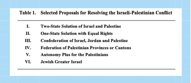 Otras propuestas para resolver el conflicto entre Israel y Palestina incluyen una confederación de Israel, Jordania y Palestina, una federación de provincias o cantones palestinos más pequeños, una autonomía adicional para los palestinos y el establecimiento de un gran Israel judío (Tabla 1).