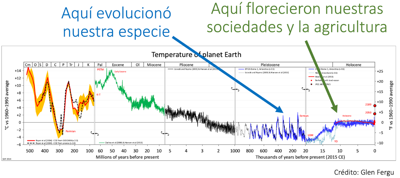 Figura 1: El Holoceno, la época geológica en donde florecieron nuestras sociedades, comenzó hace aproximadamente 11 mil 700 años. Ahora estamos en un periodo de cambio global acelerado producto de las actividades humanas, por ello, hay quienes proponen la idea de una nueva época: ‘Antropoceno’, otros proponen ‘Capitaloceno’.