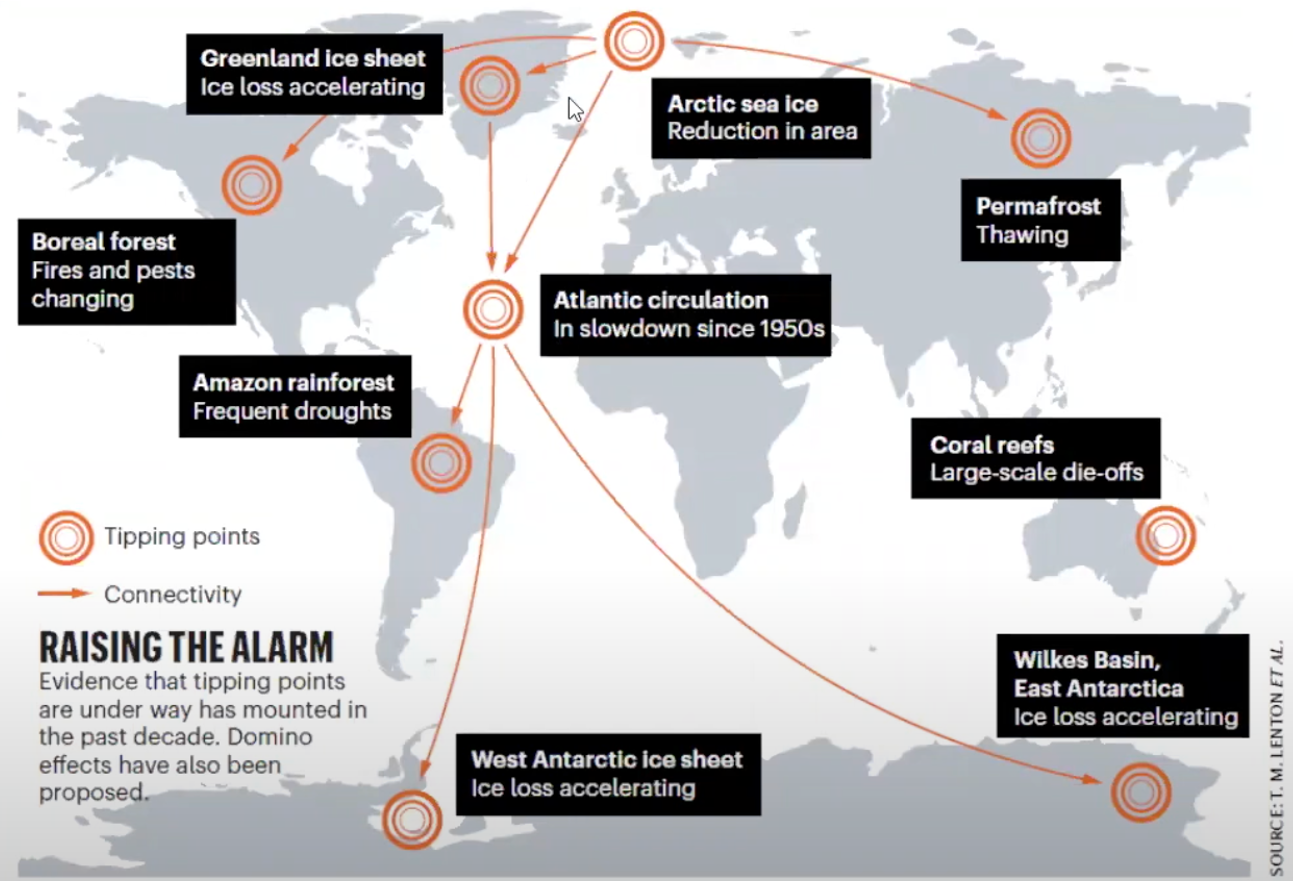Figura 3: Algunos de los puntos de inflexión (círculos naranja), y cómo interaccionan entre ellos (líneas amarillas). Imagen tomada de Lenton et al. 2019.