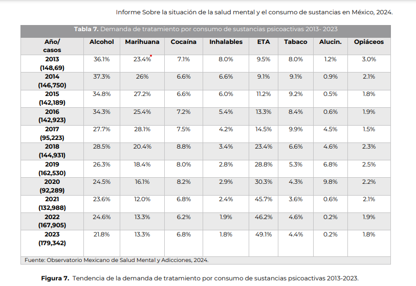Según el Informe sobre la situación de la salud mental y el consumo de sustancias en México 2024, publicado por el Observatorio Mexicano de Salud Mental y Adicciones, el número de pacientes que acuden a solicitar tratamiento por el uso estimulantes de tipo anfetamínico pasó de 9.5 por ciento en 2013, a 49.1 por ciento en 2023, lo que representó un aumento de 416 por ciento, como se observa en la siguiente tabla.