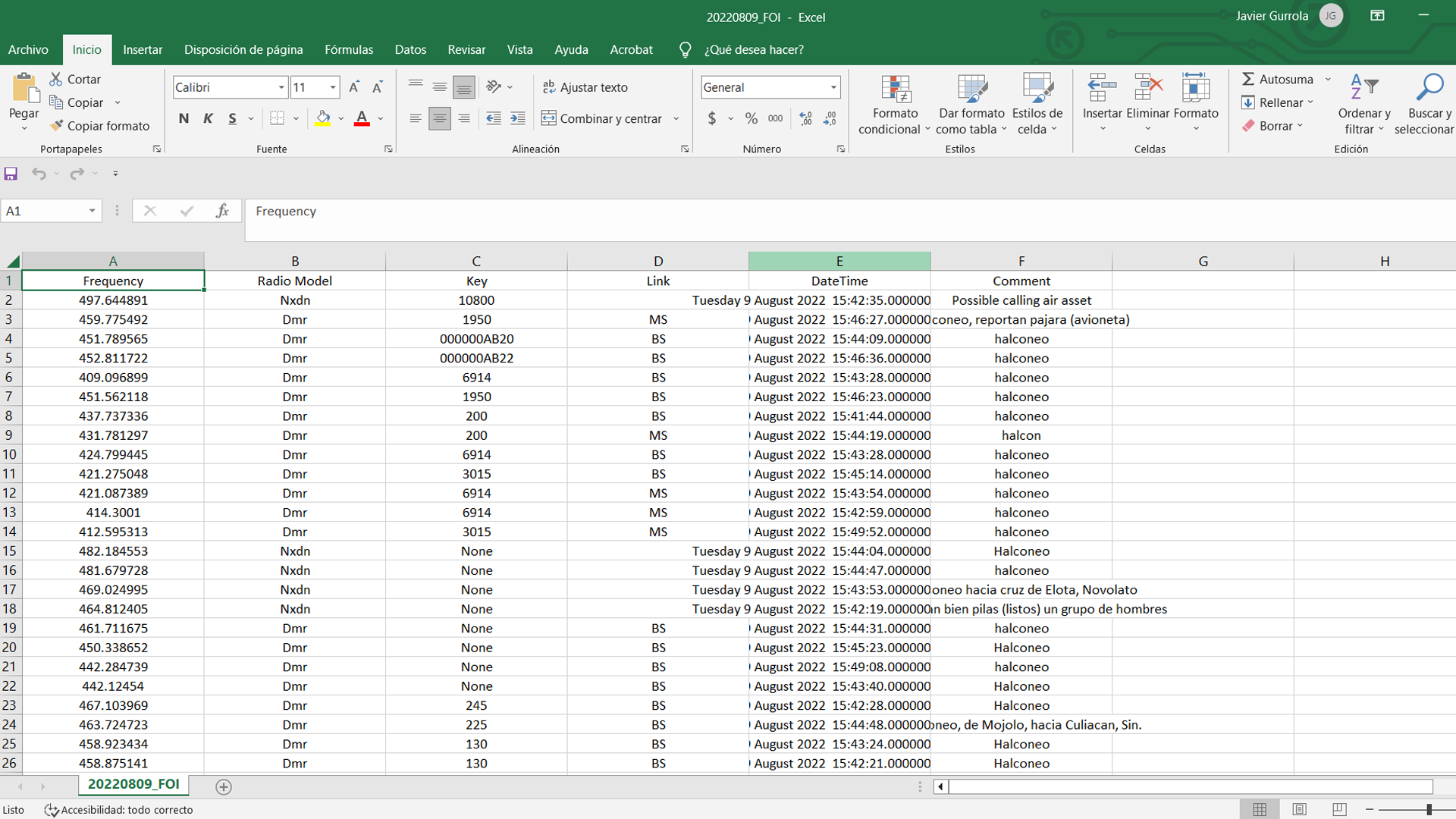 Además de los reportes con hechos relevantes que destacan los analistas de inteligencia, se incluyen las sábanas con información de las coordenadas geográficas de los lugares desde donde se establecieron las comunicaciones, el medio, las radiofrecuencias, las horas y otros datos técnicos.