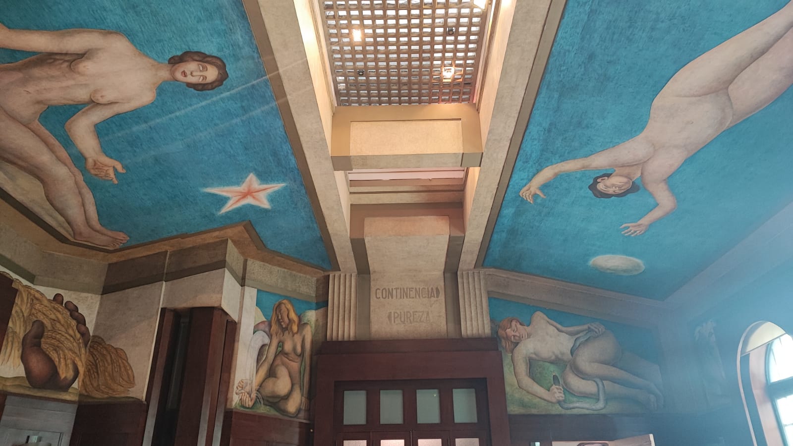 La amplia sala se encuentra vacía. La luz entra por algunas ventanas que dan a la calle y el patio del edificio, e ilumina la duela rechinante a cada paso de las y los presentes. Sus miradas sólo apuntan a una dirección: el techo y las paredes superiores de la habitación, donde las figuras desnudas de seis mujeres se han detenido en el tiempo.
