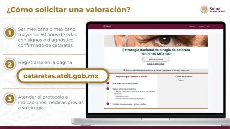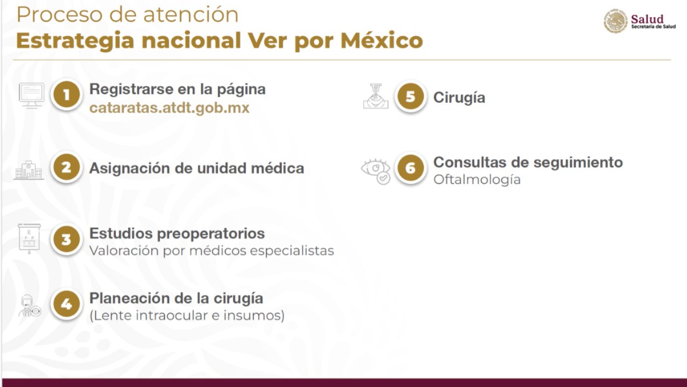 Finalmente, el subsecretario de Promoción y Fomento a la Salud explicó que, después de registrarse en la página https://www.cataratas.atdt.gob.mx/ , se asignará la unidad médica, se harán los estudios preoperatorios, se planeará la cirugía y se dará seguimiento de cinco consultas posteriores al procedimiento.
