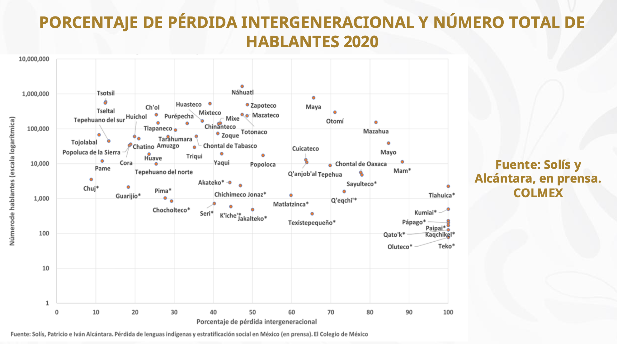 “Esto se debe a que las nuevas generaciones ya no adquieren las lenguas de sus madres y sus padres, sino que estas se van sucesivamente desplazando a favor del español. […] Incluso, hay lenguas que tienen tasas de pérdida del 100 por ciento; es decir, que ya las nuevas generaciones no están hablando y no hay nueva generación para transmitir la lengua. Es el caso de muchas lenguas yumanas como el kumiai y el paipai”, declaró Violeta Vázquez en la conferencia presidencial del 21 de febrero.