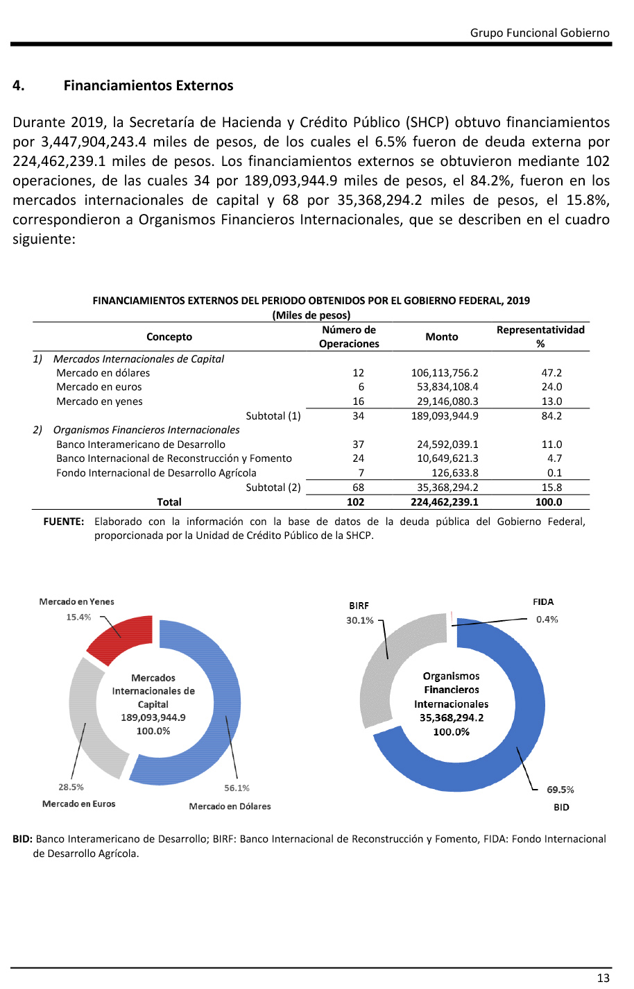 Sobre la deuda externa, por 224 mil 462 millones 239 mil 100 pesos, indica que el 84.2 por ciento –189 mil 93 millones 944 mil 900– provino de mercados internaciones de capital, y el 15.8 por ciento restantes, de organismos financieros internacionales.