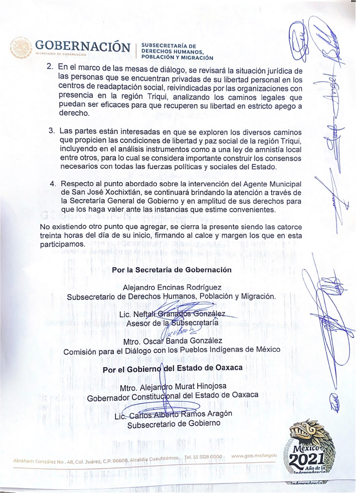Además, indica el documento, “las partes están interesadas en que se exploren los diversos caminos que propicien las condiciones de libertad y paz social de la región Triqui, incluyendo en el análisis instrumentos como a una ley de amnistía local entre otros, para lo cual se considera importante construir los consensos necesarios con todas las fuerzas políticas y sociales del Estado”.