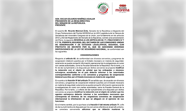 El pleno del Senado de la República aprobó con reservas la iniciativa de reforma a la Ley de Seguridad Nacional que envió el presidente de la República hace una semana. Las reservas a tres artículos de la ley buscan proteger la “confidencialidad” de la información que recaben los agentes extranjeros en el país.