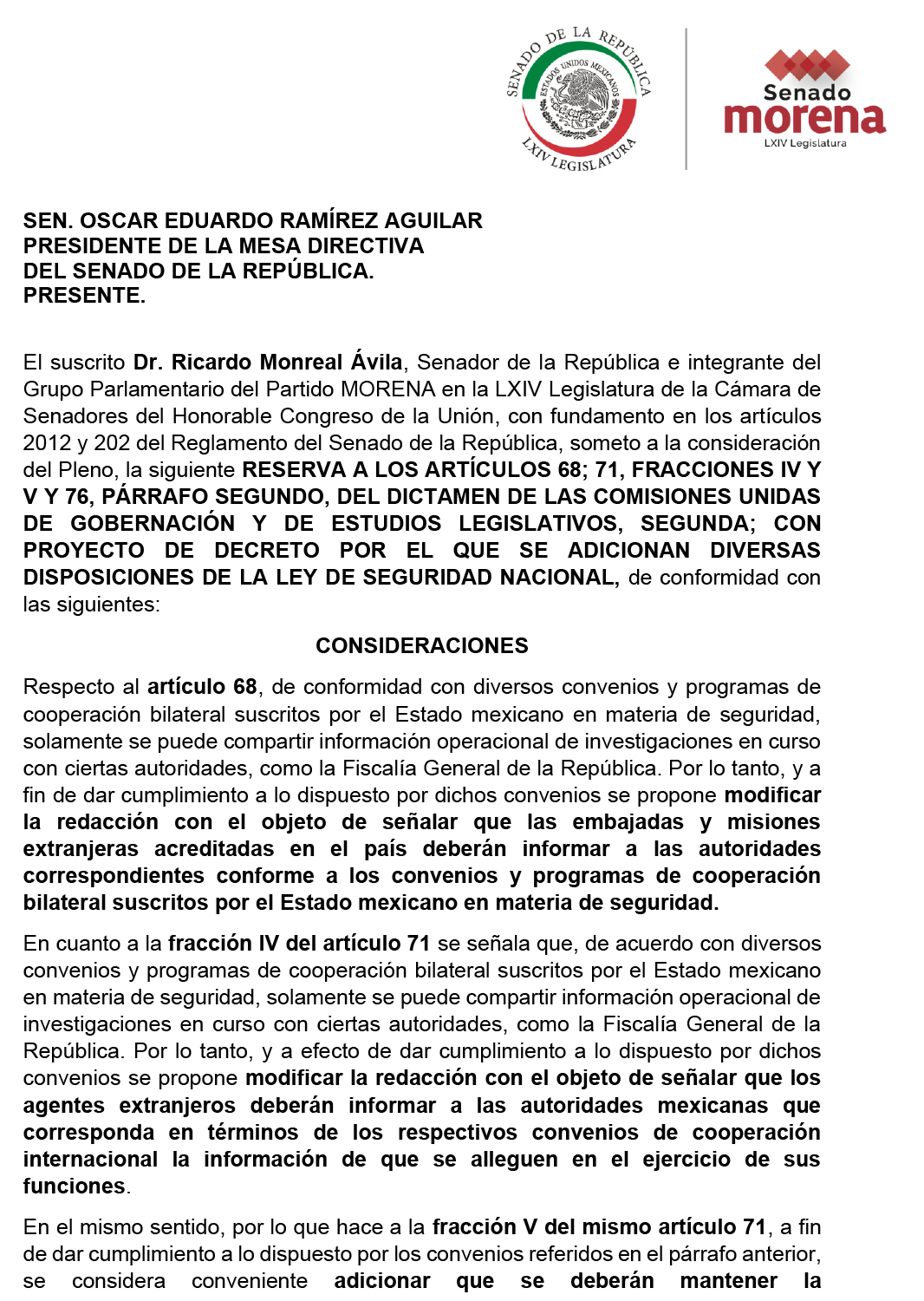 Las modificaciones a la iniciativa fueron propuestas por el senador Ricardo Monreal, coordinador de los senadores del gobernante Movimiento Regeneración Nacional (Morena) y presidente de la Junta de Coordinación Política del Senado. Se trata de cambios en la redacción de los artículos 68; 71, fracciones IV y V, y 76, párrafo segundo.