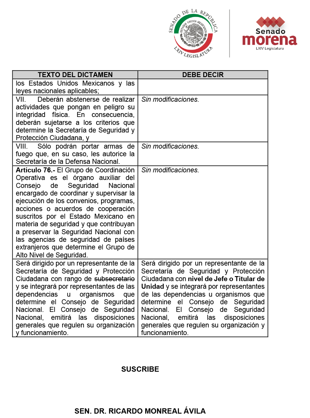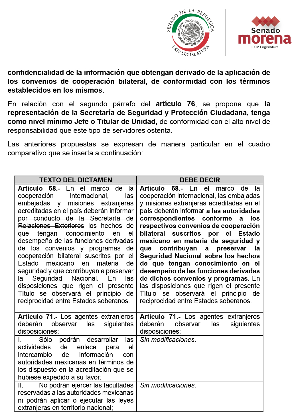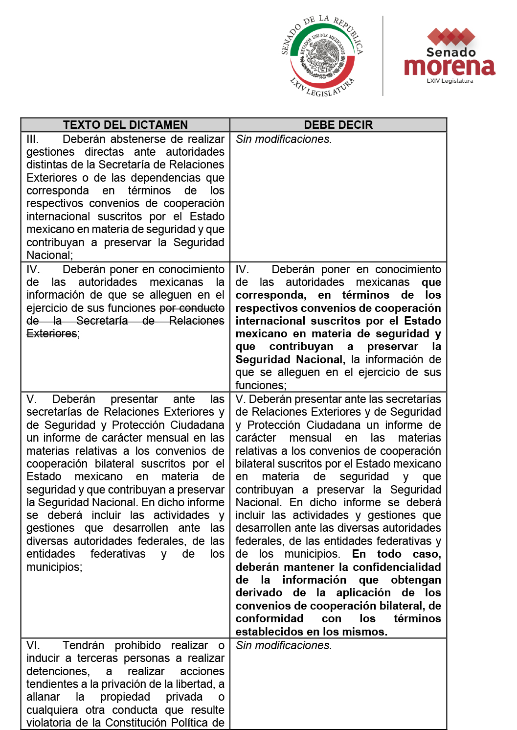 También especifica que el Grupo de Coordinación Operativa, encargado de coordinar y supervisar la ejecución de los convenios y programas celebrados por México con países extranjeros, deberá ser encabezado por un jefe o titular de unidad de la Secretaría de Seguridad y Protección Ciudadana. Y no por un subsecretario, como decía el texto original de la iniciativa de reforma.