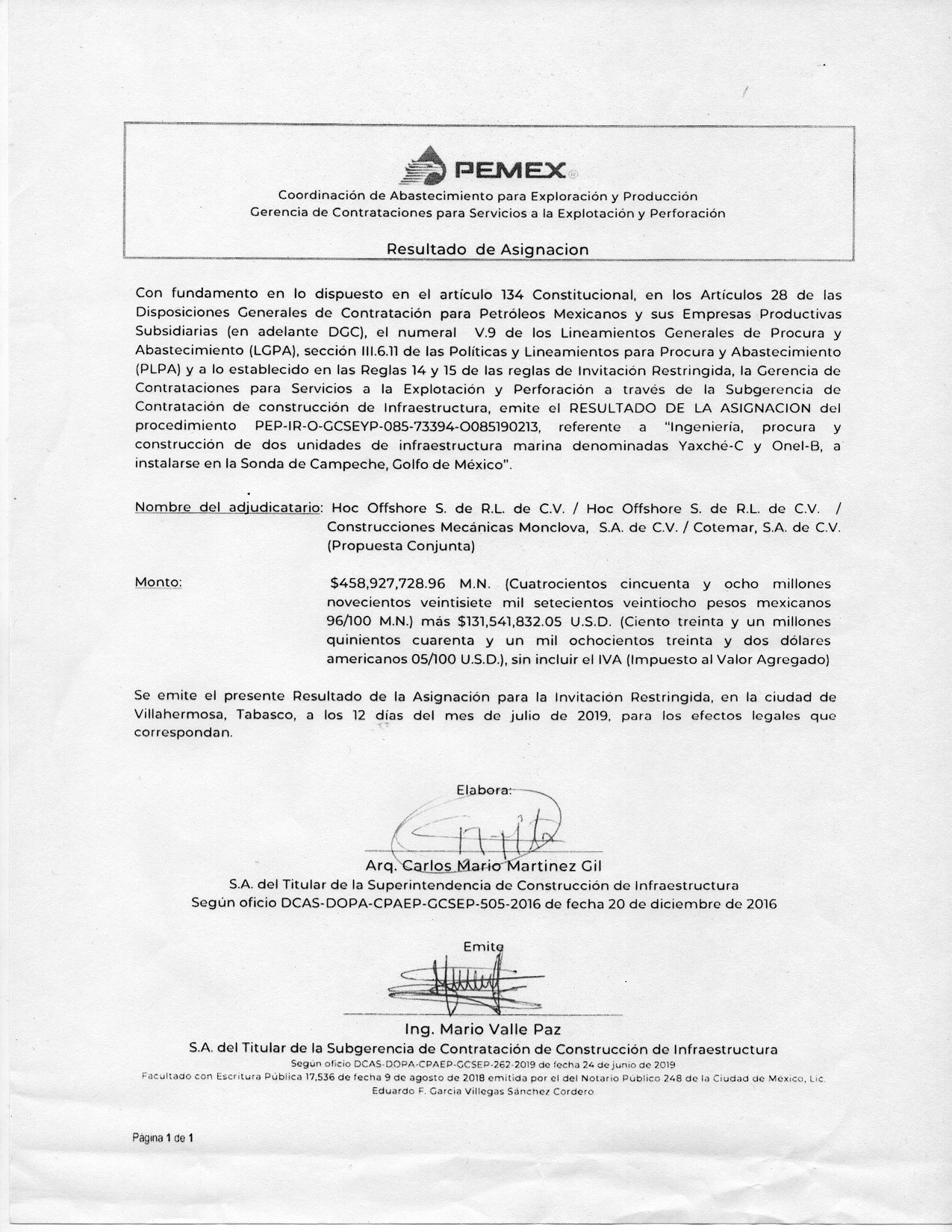Dicha asignación firmada por el arquitecto Carlos Mario Martínez Gil, titular de la Superintendencia de Construcción de Infraestructura, y el ingeniero Mario Valle Paz, titular de la Subgerencia de Contratación de Construcción de Infraestructura, corresponde al número PEP-IR-O-GCSEYP-085-73394-0085190213, referente a “Ingeniería, procura y construcción de dos unidades de infraestructura marina denominadas Yaxché-C y Onel-B, a instalarse en la Sonda de Campeche, Golfo de México”.