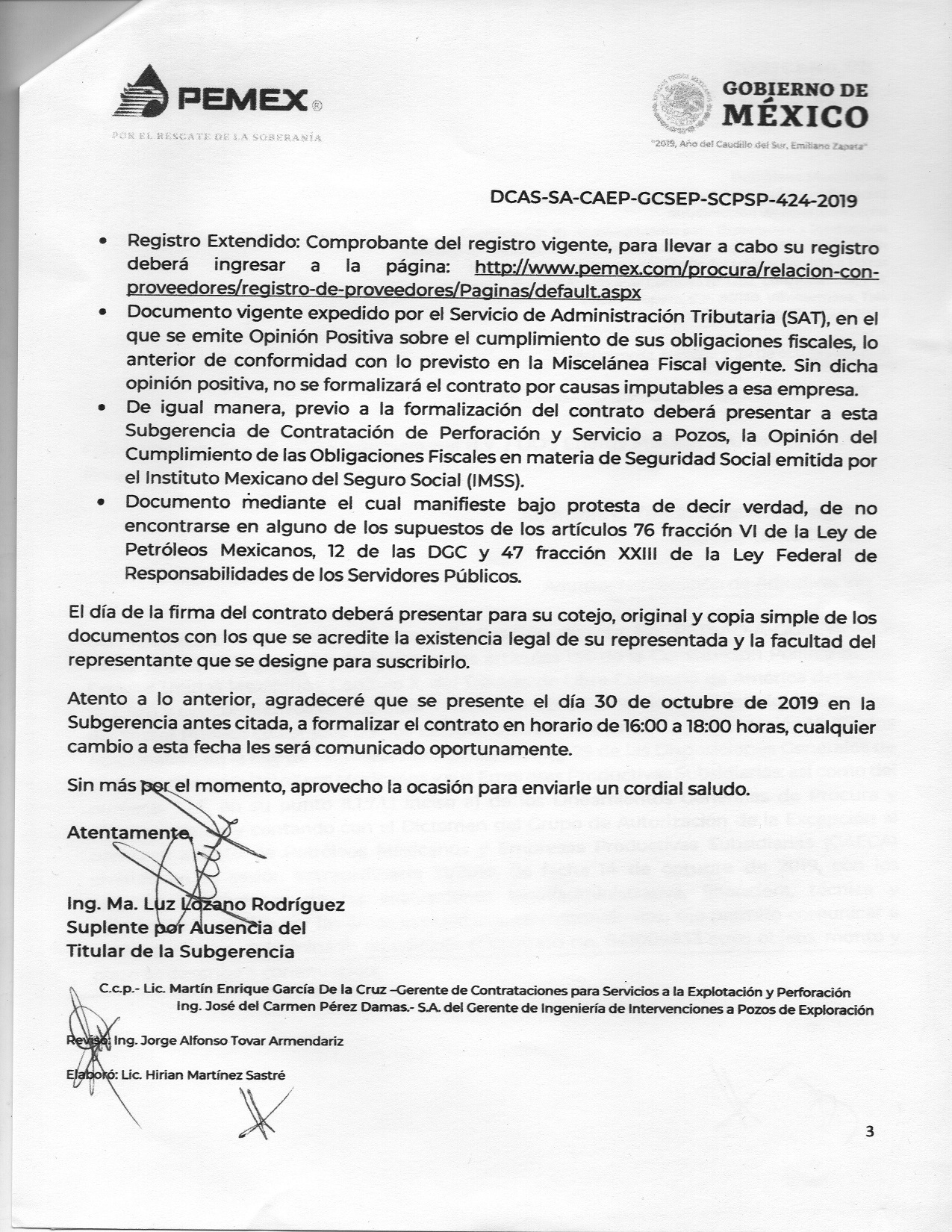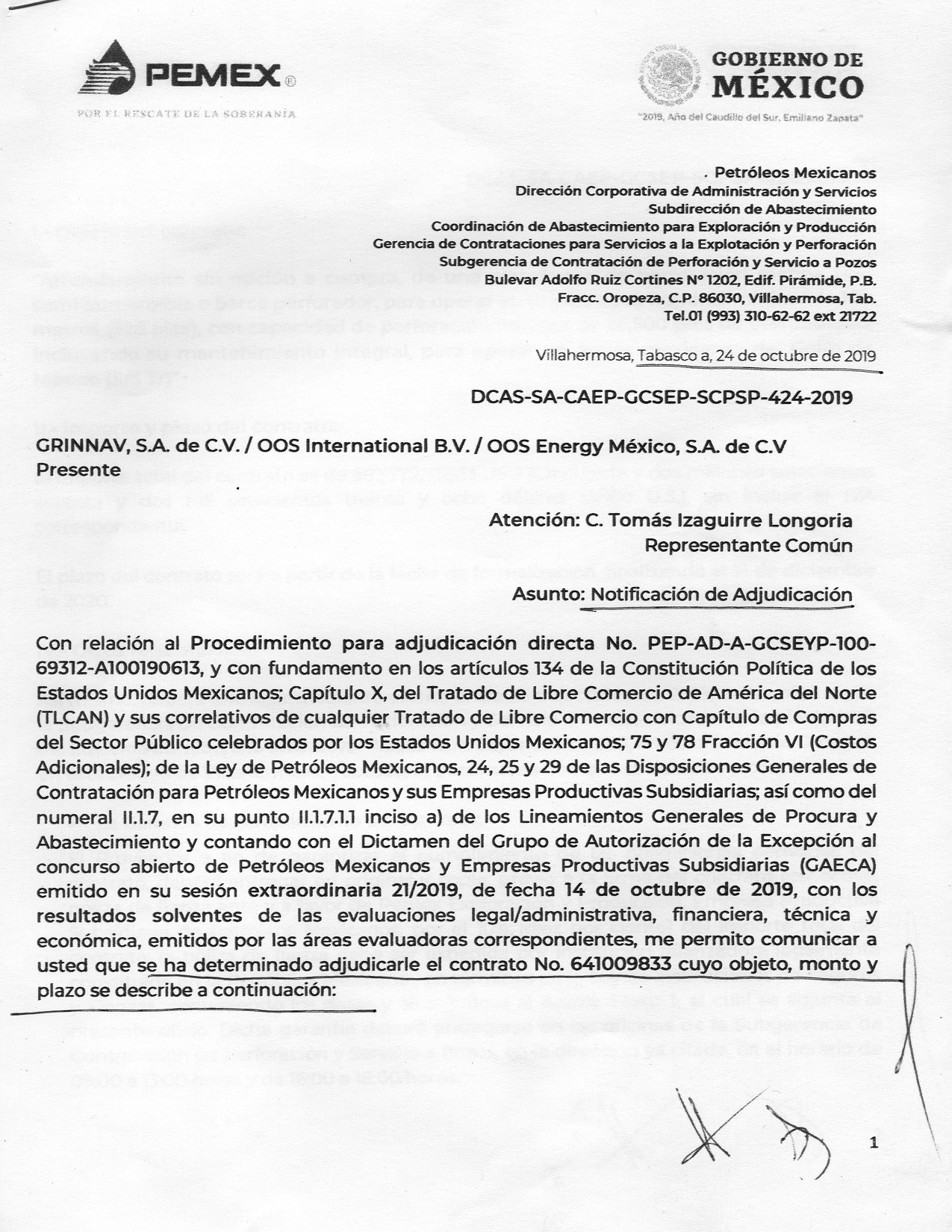 En uno de esos oficios en poder de esta columna, DCAS-SA-CAEP-GCSEP-SCPSP-424-2019, la Subgerencia de Contratación de Perforación y Servicio de Pozos, bajo las órdenes del director corporativo Marcos Herrería y firmado por la suplente ingeniera María de la Luz Lozano Rodríguez, se informa que mediante el procedimiento para adjudicación directa No. PEP-AD-A-GCSEYP-100-69312-A100190613, y después de una “evaluación legal, administrativa, financiera, técnica y económica”, se determinó adjudicarles el contrato No. 641009833 a las empresas Grinnav, SA, OOS International, BV, y OSS Energy México, SA de CV, por un importe total de 52 millones 772 mil 738.13 dólares, que a precios actuales asciende a 1 mil 134 millones 606 mil pesos.