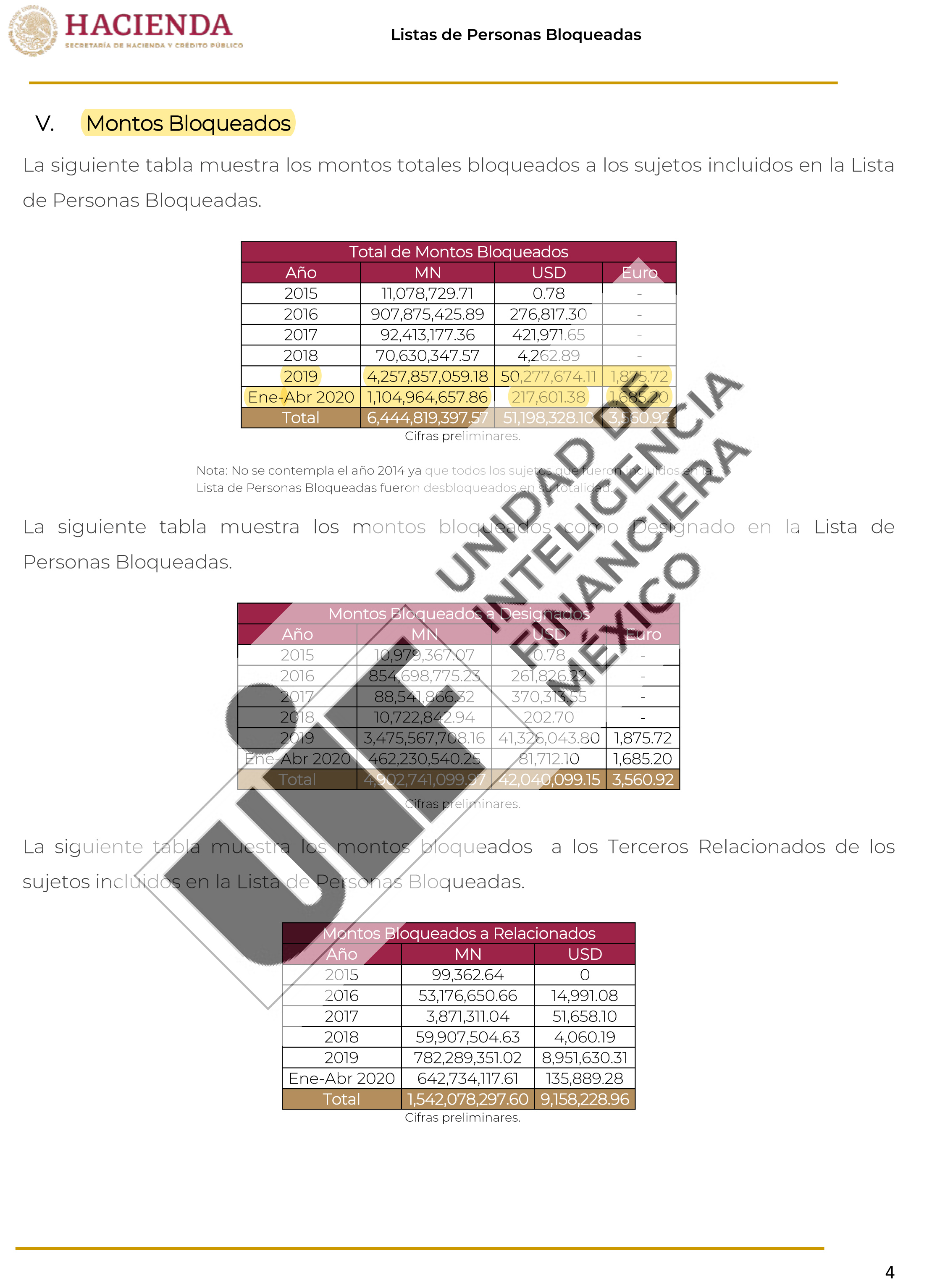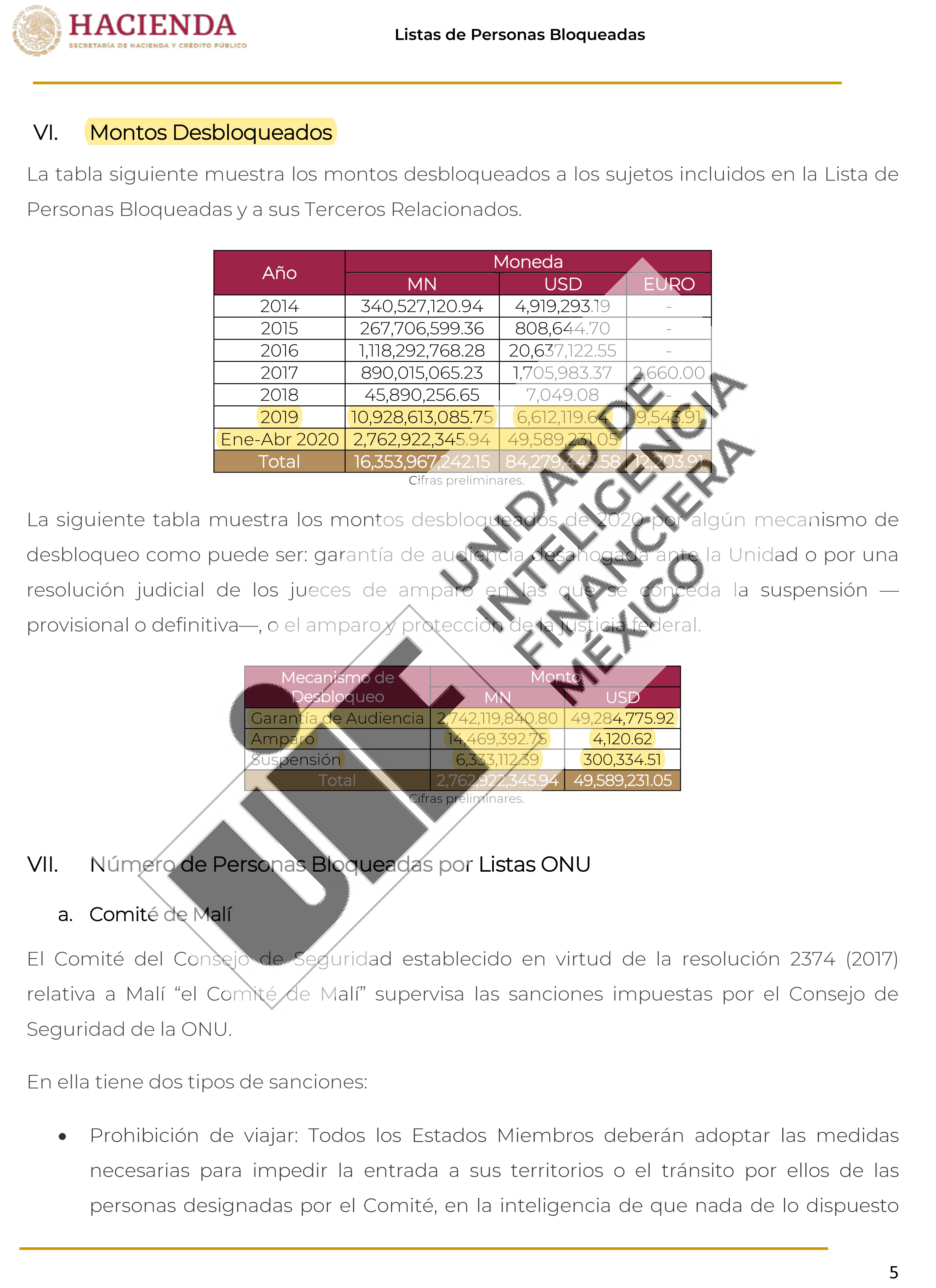 En total, la UIF ha liberado alrededor de 14 mil 928 millones 203 mil 705 pesos en lo que va del gobierno de Andrés Manuel López Obrador, revela el informe Listas de Personas Bloqueadas (enero-abril de 2020), elaborado por el propio órgano dependiente de la Secretaría de Hacienda y Crédito Público.