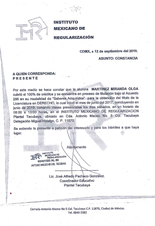 Para “comprobar” su dicho, presentó un certificado –sin validez oficial– expedido por el Instituto Mexicano de Regularización (plantel Tacubaya) que se anexó a su archivo, y el cual fue proporcionado por la propia Secretaría como respuesta a la solicitud de información pública 0000500373619.