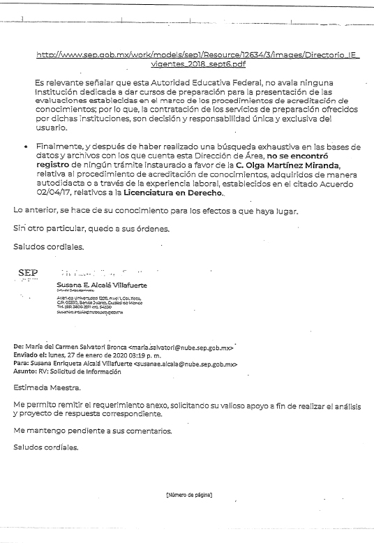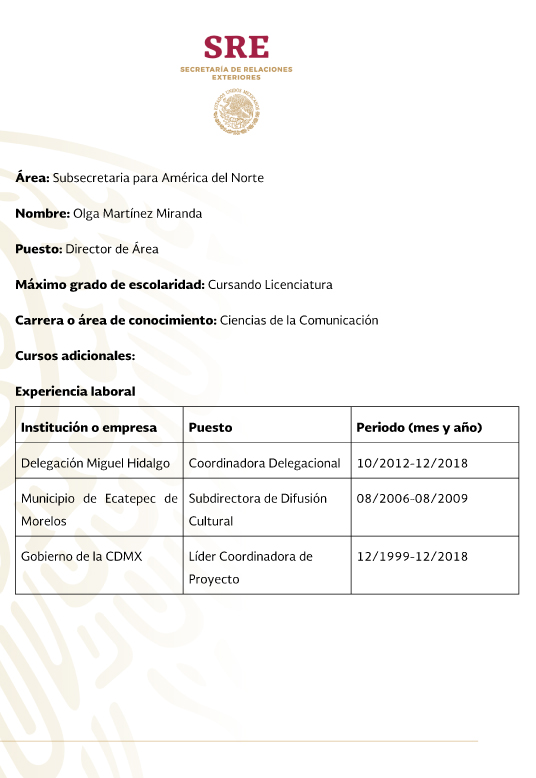 Y es que ahora Relaciones Exteriores –a través de su Dirección General del Servicio Exterior y Recursos Humanos, a cargo de Moisés Poblanno Silva– anexa un currículum modificado en el cual Martínez Miranda informa como máximo grado de escolaridad: “cursando licenciatura”; y como carrera o área de conocimiento: “ciencias de la comunicación”, ya sin hacer referencia a su supuesto certificado de la licenciatura en derecho, de la cual según sólo le faltaba el proceso de titulación (disponible en: https://transparencia.sre.gob.mx/index.php/transparencia-categorias/category/53-xvii-datos-curriculares?download=85625:olga-martinez-miranda&start=1660).