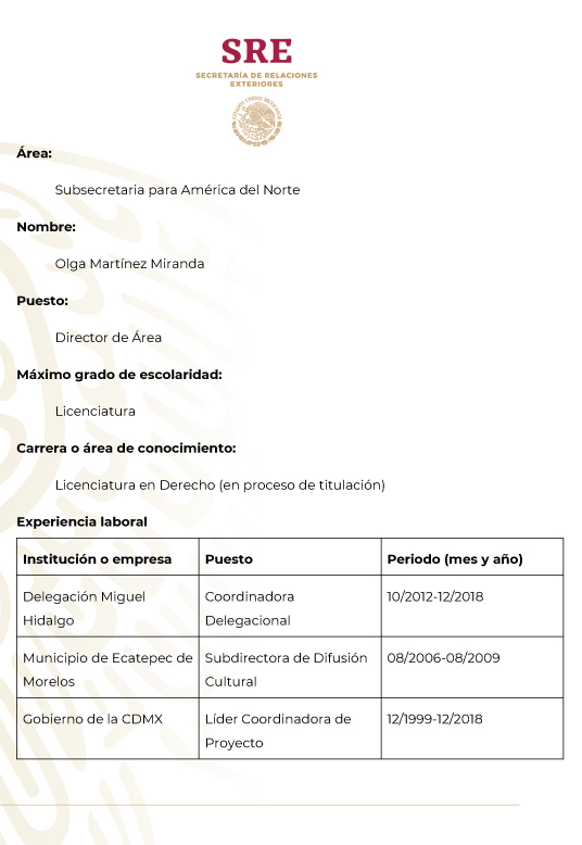 De acuerdo con las denuncias, Olga Martínez Miranda carecería del perfil adecuado para el puesto no sólo por su falta de estudios universitarios, sino porque su experiencia laboral previa fue en tareas de difusión cultural y apoyo en festivales en el municipio de Ecatepec y la alcaldía Miguel Hidalgo. Nada de ello involucró relaciones internacionales ni comerciales.