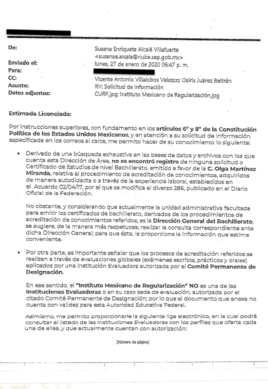Aunado a ello, la SEP –a través de la Dirección General de Acreditación, Incorporación y Revalidación– aseguró que el Instituto Mexicano de Regularización [de la que procede el certificado presentado por Olga Martínez] “no es una de las instituciones evaluadoras o en su caso sede de evaluación autorizada por el Comité Permanente de Designación, por lo que el documento que anexa no cuenta con validez para esta autoridad educativa federal”.